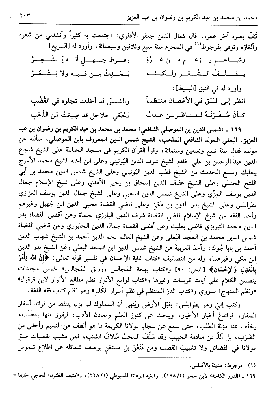 مُحَمَّد بن مُحَمَّد بن عبد الْكَرِيم ابْن رضوَان بن عبد الْعَزِيز البعلي المولد الشَّافِعِي الْمَذْهَب الشَّيْخ شمس الدّين الْمَعْرُوف بِابْن الْموصِلِي سَأَلته عَن مولده فَقَالَ سنة تسع وَتِسْعين وست مائَة وَقَرَأَ الْقُرْآن الْكَرِيم فِي مَسْجِد الْحَنَابِلَة على الشَّيْخ شُجَاع الدّين عبد الرَّحْمَن بن عَليّ خَادِم الشَّيْخ شرف الدّين اليونيني وَعلي ابْن أَخِيه الشَّيْخ مُحَمَّد الْأَعْرَج ببعلبك وَسمع الحَدِيث من الشَّيْخ قطب الدّين اليونيني وعَلى الشَّيْخ شمس الدّين مُحَمَّد بن أبي الْفَتْح الْحَنْبَلِيّ وعَلى الشَّيْخ عفيف الدّين إِسْحَاق بن يحيى الْآمِدِيّ وعَلى شيخ الْإِسْلَام جمال الدّين يُوسُف الْمزي وعَلى الشَّيْخ شمس الدّين الذَّهَبِيّ وعَلى الشَّيْخ جمال الدّين يُوسُف العزازي بطرابلس وعَلى الشَّيْخ بدر الدّين ابْن مكي وعَلى قَاضِي الْقُضَاة محيي الدّين ابْن جهبل وَغَيرهم وَأخذ الْفِقْه عَن شيخ الْإِسْلَام قَاضِي الْقُضَاة شرف الدّين الْبَارِزِيّ بحماة وَعَن أقضى الْقُضَاة بدر الدّين مُحَمَّد التبريزي قَاضِي بعلبك وَعَن أقضى الْقُضَاة جمال الدّين الخابوري وَعَن قَاضِي الْقُضَاة شمس الدّين مُحَمَّد بن الْمجد البعلي وَعَن الشَّيْخ الْعَالم نجم الدّين أَحْمد بن الشَّيْخ شهَاب الدّين أَحْمد بن بَابا)