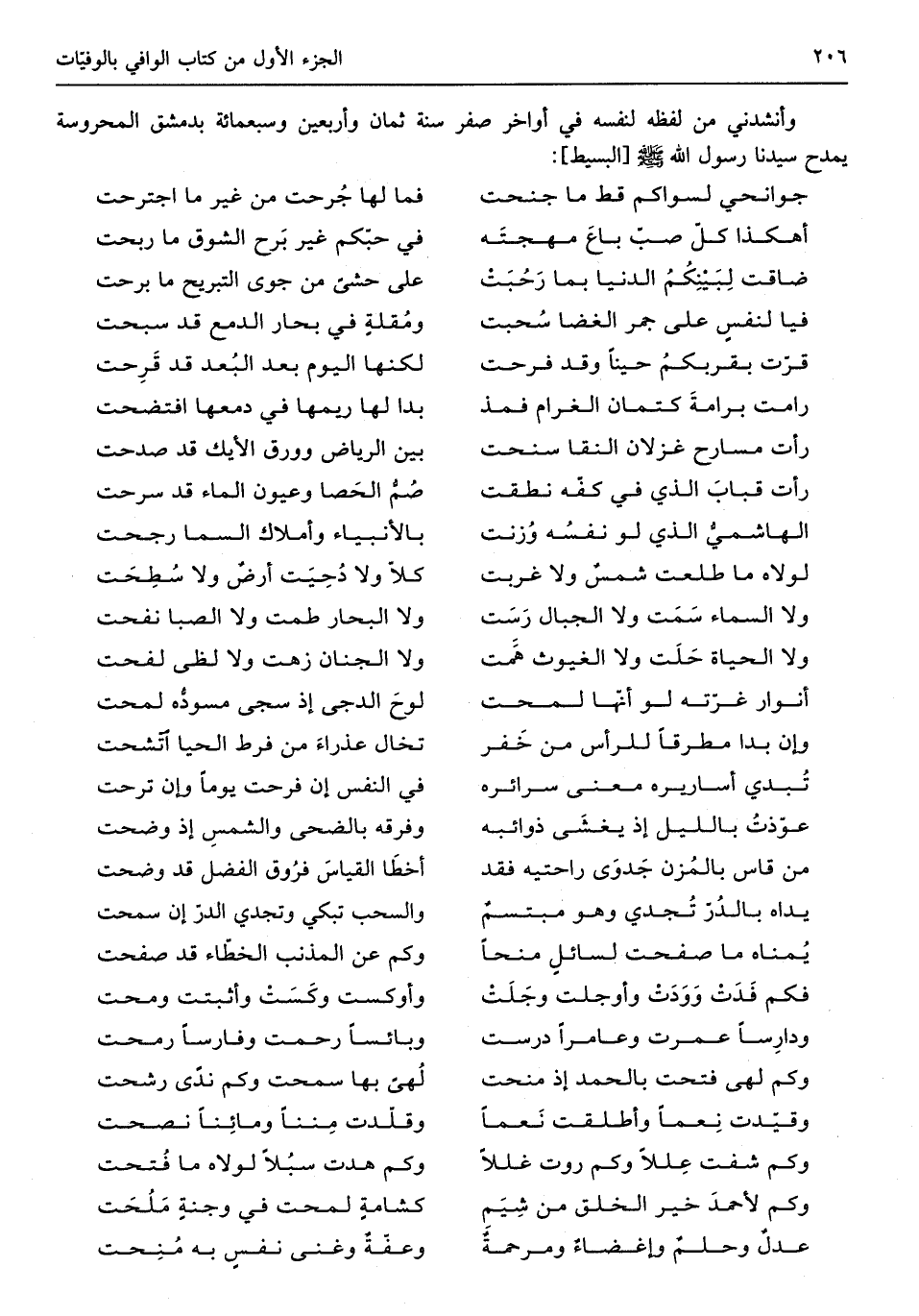 وأنشدني من لَفظه لنَفسِهِ فِي أَوَاخِر صفر سنة ثَمَان وَأَرْبَعين وَسبع مائَة بِدِمَشْق المحروسة يمدح سيدنَا رَسُول الله صلى الله عَلَيْهِ وَسلم الْبَسِيط