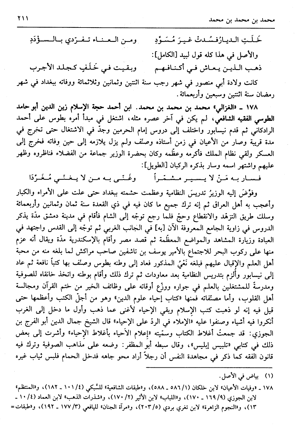 مُحَمَّد بن مُحَمَّد بن مُحَمَّد ابْن أَحْمد حجَّة الْإِسْلَام زين الدّين أَبُو حَامِد الطوسي الْفَقِيه الشَّافِعِي لم يكن فِي آخر عصره مثله اشْتغل فِي مبدأ أمره بطوس على أَحْمد الرادكاني ثمَّ قدم نيسابور وَاخْتلف إِلَى دروس أَمَام الْحَرَمَيْنِ وجد فِي الِاشْتِغَال حَتَّى تخرج فِي مُدَّة قريبَة وَصَارَ من الْأَعْيَان فِي زمن استاذه وصنف وَلم يزل يلازمه إِلَى حِين وَفَاته فَخرج إِلَى الْعَسْكَر وَلَقي نظام الْملك فَأكْرمه وعظمه وَكَانَ بِحَضْرَة الْوَزير جمَاعَة من الْفُضَلَاء فناظروه وَظهر عَلَيْهِم واشتهر اسْمه وَسَار بِذكرِهِ الركْبَان الطَّوِيل