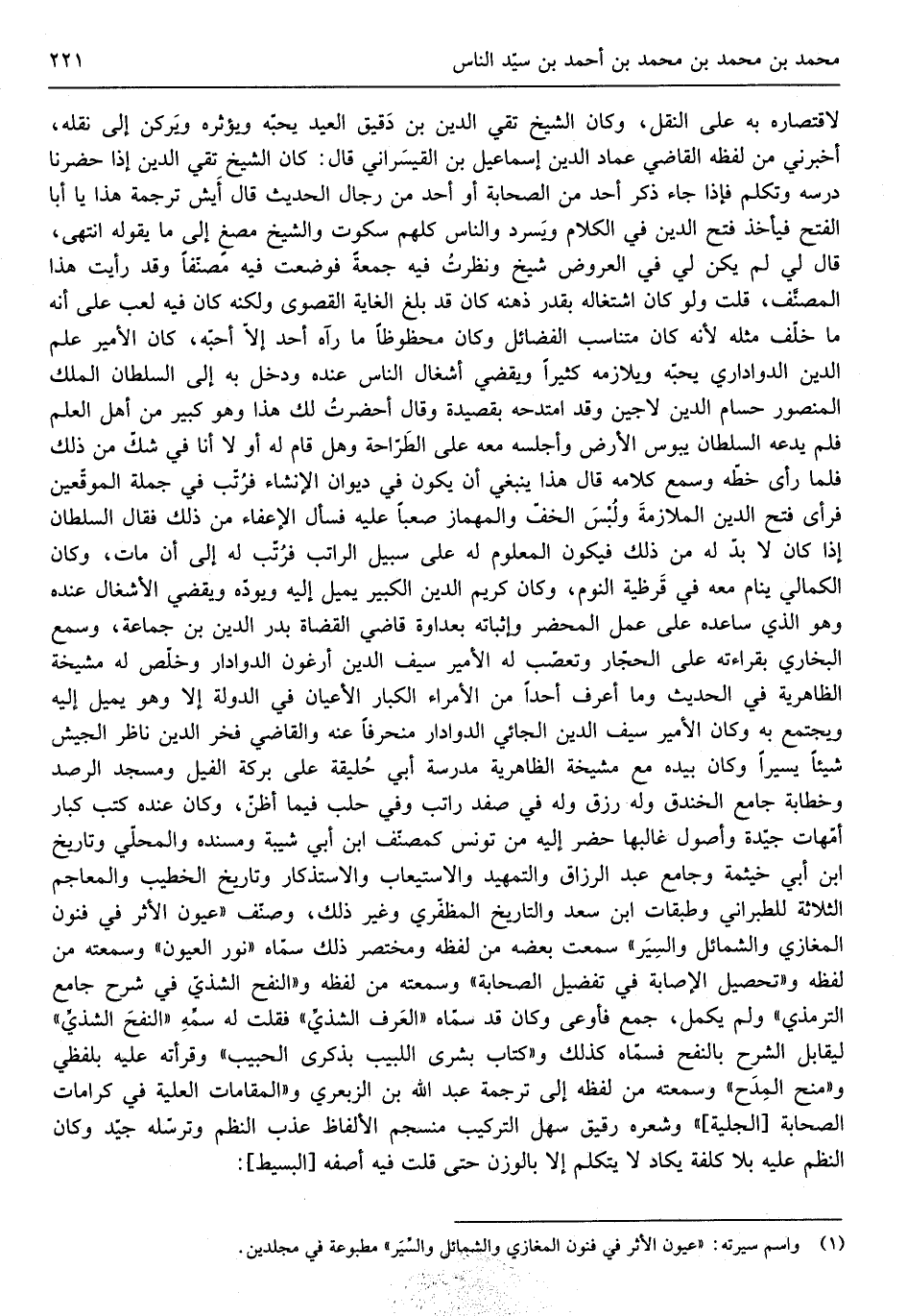 تَرْجَمَة هَذَا يَا أَبَا الْفَتْح فَيَأْخُذ فتح الدّين فِي الْكَلَام ويسرد وَالنَّاس كلهم سكُوت وَالشَّيْخ مصغ إِلَى مَا يَقُوله انْتهى قَالَ لي لم يكن لي فِي الْعرُوض شيخ وَنظرت فِيهِ جُمُعَة فَوضعت فِيهِ مصنفاً وَقد رَأَيْت هَذَا المُصَنّف قلت وَلَو كَانَ اشْتِغَاله بِقدر ذهنه كَانَ قد بلغ الْغَايَة القصوى وَلكنه كَانَ فِيهِ لعب على أَنه مَا خلف مثله لإنه كَانَ متناسب الْفَضَائِل وَكَانَ محظوظاً مَا رَآهُ أحد إِلَّا أحبه كَانَ الْأَمِير علم الدّين الدواداري يُحِبهُ ويلازمه كثيرا وَيَقْضِي أشغال النَّاس عِنْده وَدخل بِهِ إِلَى السُّلْطَان الْملك الْمَنْصُور حسام الدّين لاجين وَقد امتدحه بقصيدة وَقَالَ احضرت لَك هَذَا وَهُوَ كَبِير من أهل الْعلم فَلم يَدعه السُّلْطَان يبوس الأَرْض وَأَجْلسهُ مَعَه على الطراحة وَهل قَامَ لَهُ أَو لَا أَنا فِي شكّ من ذَلِك فَلَمَّا رأى خطه وَسمع كَلَامه قَالَ هَذَا يَنْبَغِي أَن يكون فِي ديوَان الْإِنْشَاء فرتب فِي جملَة الموقعين فَرَأى فتح الدّين الْمُلَازمَة وَلبس الْخُف والمهماز صعباً عَلَيْهِ فَسَأَلَ الإعفاء من ذَلِك فَقَالَ السُّلْطَان إِذا كَانَ لَا بُد لَهُ من ذَلِك فَيكون الْمَعْلُوم لَهُ على سَبِيل الرَّاتِب فرتب لَهُ إِلَى أَن مَاتَ وَكَانَ الكمالي ينَام مَعَه فِي قرظية النّوم وَكَانَ كريم الدّين الْكَبِير يمِيل إِلَيْهِ ويوده وَيَقْضِي الإشغال عِنْده وَهُوَ الَّذِي ساعده على عمل الْمحْضر واثباته بعداوة قَاضِي الْقُضَاة بدر الدّين ابْن جمَاعَة وَسمع البُخَارِيّ بقرَاءَته على الحجار وتعصب لَهُ الْأَمِير سيف الدّين أرغون الدوادار وخلص لَهُ مشيخة الظَّاهِرِيَّة فِي الحَدِيث وَمَا أعرف أحدا من الْأُمَرَاء الْكِبَار الْأَعْيَان فِي الدولة إِلَّا وَهُوَ يمِيل إِلَيْهِ ويجتمع بِهِ وَكَانَ الْأَمِير سيف الدّين الجائي الدوادار منحرفاً عَنهُ وَالْقَاضِي فَخر الدّين نَاظر الْجَيْش شَيْئا يَسِيرا وَكَانَ بِيَدِهِ مَعَ مشيخة الظَّاهِرِيَّة مدرسة أبي حليقة على بركَة الْفِيل وَمَسْجِد الرصد وخطابة جَامع الخَنْدَق وَله رزق وَله فِي صفد راتب وَفِي حلب فِيمَا أَظن وَكَانَ عِنْده كتب كبار أُمَّهَات جَيِّدَة وأصول غالبها حضر إِلَيْهِ من تونس كمصنف ابْن أبي شيبَة وَمُسْنَده والمحلى وتاريخ ابْن أبي خَيْثَمَة وجامع عبد الرَّزَّاق والتمهيد والاستيعاب والاستذكار وتاريخ الْخَطِيب والمعاجم الثَّلَاثَة للطبراني وطبقات ابْن سعد والتاريخ المظفري وَغير ذَلِك وصنف عيونه السّير فِي فنون الْمَغَازِي وَالشَّمَائِل وَالسير سَمِعت بعضه من لَفظه ومختصر ذَلِك سَمَّاهُ نور الْعُيُون وسمعته من لَفظه وَتَحْصِيل الْإِصَابَة فِي تَفْضِيل الصَّحَابَة وسمعته من لَفظه والنفح الشذي فِي شرح جَامع التِّرْمِذِيّ وَلم يكمل جمع فأوعى وَكَانَ قد سَمَّاهُ الْعرف الشذي فَقلت لَهُ سمه النفح الشذي ليقابل الشَّرْح بالنفح فَسَماهُ كَذَلِك وَكتاب بشرى اللبيب بذكرى الحبيب وقرأته عَلَيْهِ بلفظي ومنح الْمَدْح وسمعته من لَفظه إِلَى تَرْجَمَة عبد الله بن الزبعري والمقامات الْعلية فِي كرامات الصَّحَابَة الجلية وشعره رَقِيق سهل التَّرْكِيب منسجم الْأَلْفَاظ عذب النّظم وترسله)