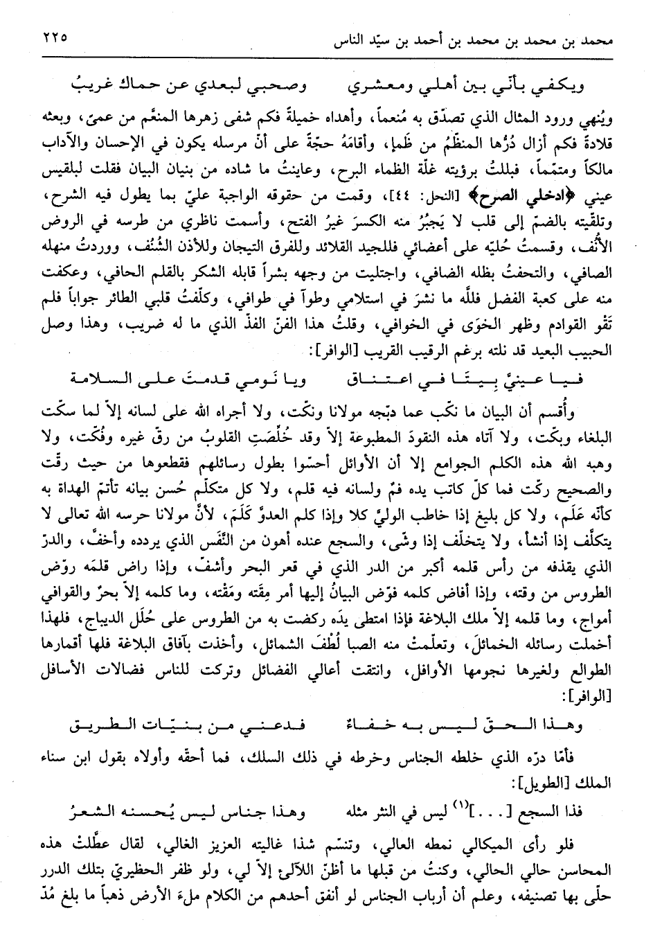 وَينْهى وُرُود الْمِثَال الَّذِي تصدق بِهِ منعماً وأهداه خميلة فكم شفى زهرها الْمُنعم من عمى وَبَعثه قلادة فكم أَزَال درها المنظم من ظما وَإِقَامَة حجَّة على أَن مرسله يكون فِي الْإِحْسَان والآداب مَالِكًا ومتمماً فبللت بِرُؤْيَتِهِ غلَّة الظماء البرح وعاينت مَا شاده من بُنيان الْبَيَان فَقلت لبلقيس عَيْني ادخلي الصرح النَّحْل وَقمت من حُقُوقه الْوَاجِبَة عَليّ بِمَا يطول فِيهِ الشَّرْح وتلقيته بِالضَّمِّ إِلَى قلب لَا يجْبر مِنْهُ الْكسر غير الْفَتْح واسمت ناظري من طرسه فِي الرَّوْض الْأنف وَقسمت حليه على أعضائي فللجيد القلائد وللفرق التيجان وللأذن الشنف ووردت منهله الصافي والتحفت بظله الضافي واجتليت من وَجهه بشرا قابله الشُّكْر بالقلم الحافي وعكفت مِنْهُ على كعبة الْفضل فَللَّه مَا نشر فِي استلامي وطوى فِي طوافي وكلفت قلبِي الطَّائِر جَوَابا فَلم تقو القوادم وَظهر الخوى فِي الخوافي وَقلت هَذَا الْفَنّ الْفَذ الَّذِي مَا لَهُ ضريب وَهَذَا وصل الحبيب الْبعيد قد نلته برغم الرَّقِيب الْقَرِيب الوافر