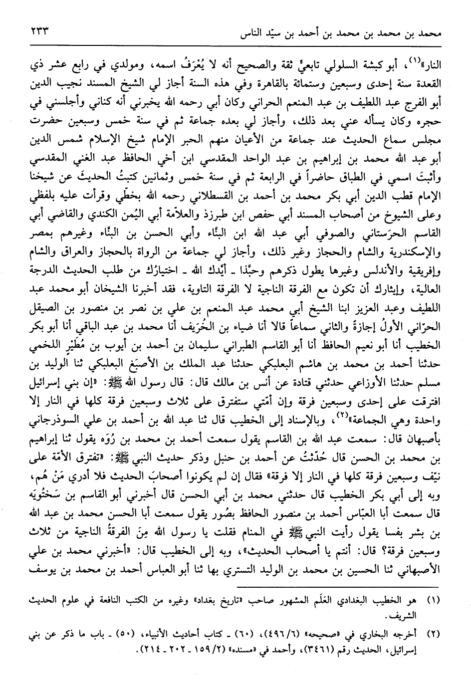 فرقة كلهَا فِي النَّار إِلَّا وَاحِدَة وَهِي الْجَمَاعَة وَبِالْإِسْنَادِ إِلَى الْخَطِيب قَالَ ثنى عبد الله بن أَحْمد بن عَليّ السوذرجاني بأصبهان قَالَ سَمِعت عبد الله بن الْقَاسِم يَقُول سَمِعت أَحْمد بن مُحَمَّد بن روه يَقُول ثَنَا ابراهيم بن مُحَمَّد بن الْحسن قَالَ حدثت عَن أَحْمد بن حَنْبَل وَذكر حَدِيث النَّبِي صلى الله عَلَيْهِ وَسلم تفترق الْأمة على نَيف وَسبعين فرقة كلهَا فِي النَّار إِلَّا فرقة فَقَالَ إِن لم يَكُونُوا أَصْحَاب الحَدِيث فَلَا أَدْرِي من هم وَبِه إِلَى أبي بكر الْخَطِيب قَالَ حَدثنِي مُحَمَّد بن أبي الْحسن قَالَ أَخْبرنِي أَبُو الْقَاسِم بن سختويه قَالَ سَمِعت أَبَا الْعَبَّاس أَحْمد بن مَنْصُور الْحَافِظ بصور يَقُول سَمِعت أَبَا الْحسن مُحَمَّد بن عبد الله بن بشر بفسا يَقُول رأيتُ النبيَّ صلّى الله عَلَيْهِ وسلّم فِي الْمَنَام فَقلت يَا رَسُول الله من الْفرْقَة النَّاجِية من ثَلَاث وَسبعين فرقة قَالَ أَنْتُم يَا أَصْحَاب الحَدِيث وَبِه إِلَى الْخَطِيب قَالَ أَخْبرنِي مُحَمَّد بن عَليّ الْأَصْبَهَانِيّ ثَنَا الْحُسَيْن بن مُحَمَّد بن الْوَلِيد التسترِي بهَا ثَنَا أَبُو الْعَبَّاس أَحْمد بن مُحَمَّد بن يُوسُف