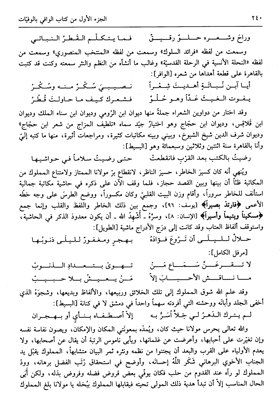 وَالله تَعَالَى يحرس مَوْلَانَا حَيْثُ كَانَ ويمده بمعونتي الْمَكَان والإمكان ويصون نفاسة نَفسه وَإِن تَغَيَّرت على أحبابها وأعرضت عَن غلمانها ويأبى ناموس الرُّتْبَة أَن يُقَال عَن أَصْحَابهَا وَلَا يعْدم الْأَوْلِيَاء على الْقرب والبعد أَن يجتنوا من نظمه ونثره ثَمَر الْبَيَان متشابهاً الْمَمْلُوك يقبل يَد الجناب الأخوي البرهاني شكر الله احسانه وأوضح فِي اسْتِحْقَاق رتب الْفضل برهانه وود الْمَمْلُوك لَو رَآهُ عِنْد الْقدوم من حلب فَكَانَ يُوفي بعض قروض فَضله وفروض بذله وَلَكِن أَبى الْحَال الْمُنَاسب إِلَّا أَن تبدأ هَدِيَّة ذَلِك الْمولى تحيته فيقابلها الْمَمْلُوك ببخله يَا مَوْلَانَا بلغ الْمَمْلُوك تقدم الْمقر الْفُلَانِيّ وتبينه وتعينه وَأَرَادَ الْمَمْلُوك مطالعته