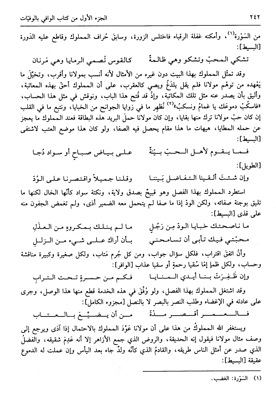 استطرد الْمَمْلُوك بِهَذَا الْفَصْل وَهُوَ قَبِيح بِصدق ولَايَة ونكتة سَواد كَأَنَّهَا الْخَال لَكِنَّهَا مَا تلِيق بوجنة صفائه وَلَكِن الود إِذا مَا صفا لم يتَحَمَّل مَعَه الضَّمِير أَذَى وَلم تغمض الجفون مِنْهُ على قذى الْبَسِيط