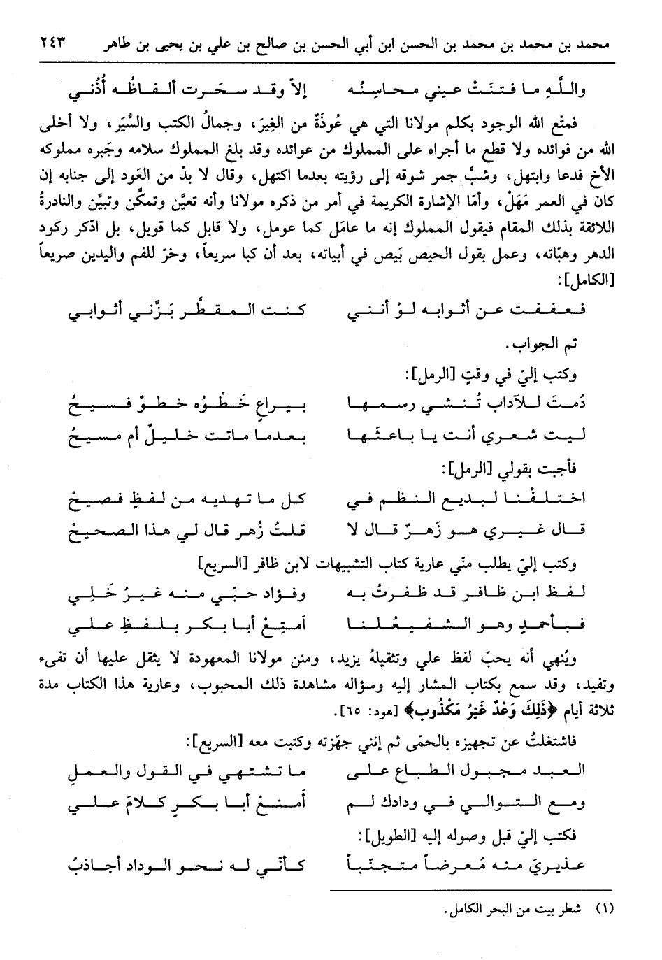 فمتع الله الْوُجُود بكلم مَوْلَانَا الَّتِي هِيَ عوذة من الْغَيْر وجمال الْكتب وَالسير وَلَا أخلى الله من فَوَائده وَلَا قطع مَا أجراه على الْمَمْلُوك من عوائده وَقد بلغ الْمَمْلُوك سَلَامه وجبره مَمْلُوكه الْأَخ فَدَعَا وابتهل وشب جمر شوقه إِلَى رُؤْيَته بَعْدَمَا اكتهل وَقَالَ لَا بُد من الْعود إِلَى جنابه إِن كَانَ فِي الْعُمر مهل وَإِمَّا الْإِشَارَة الْكَرِيمَة فِي أَمر من ذكره مَوْلَانَا وَأَنه تعين وَتمكن وَتبين والنادرة اللائقة بذلك الْمقَام فَيَقُول الْمَمْلُوك أَنه مَا عَامل كَمَا عومل وَلَا قَابل كَمَا قوبل بل ادكر ركود الدَّهْر وهباته وَعمل بقول الحيص بيص فِي أبياته بعد أَن كبا سَرِيعا وخر للفم وَالْيَدَيْنِ صَرِيعًا الْكَامِل