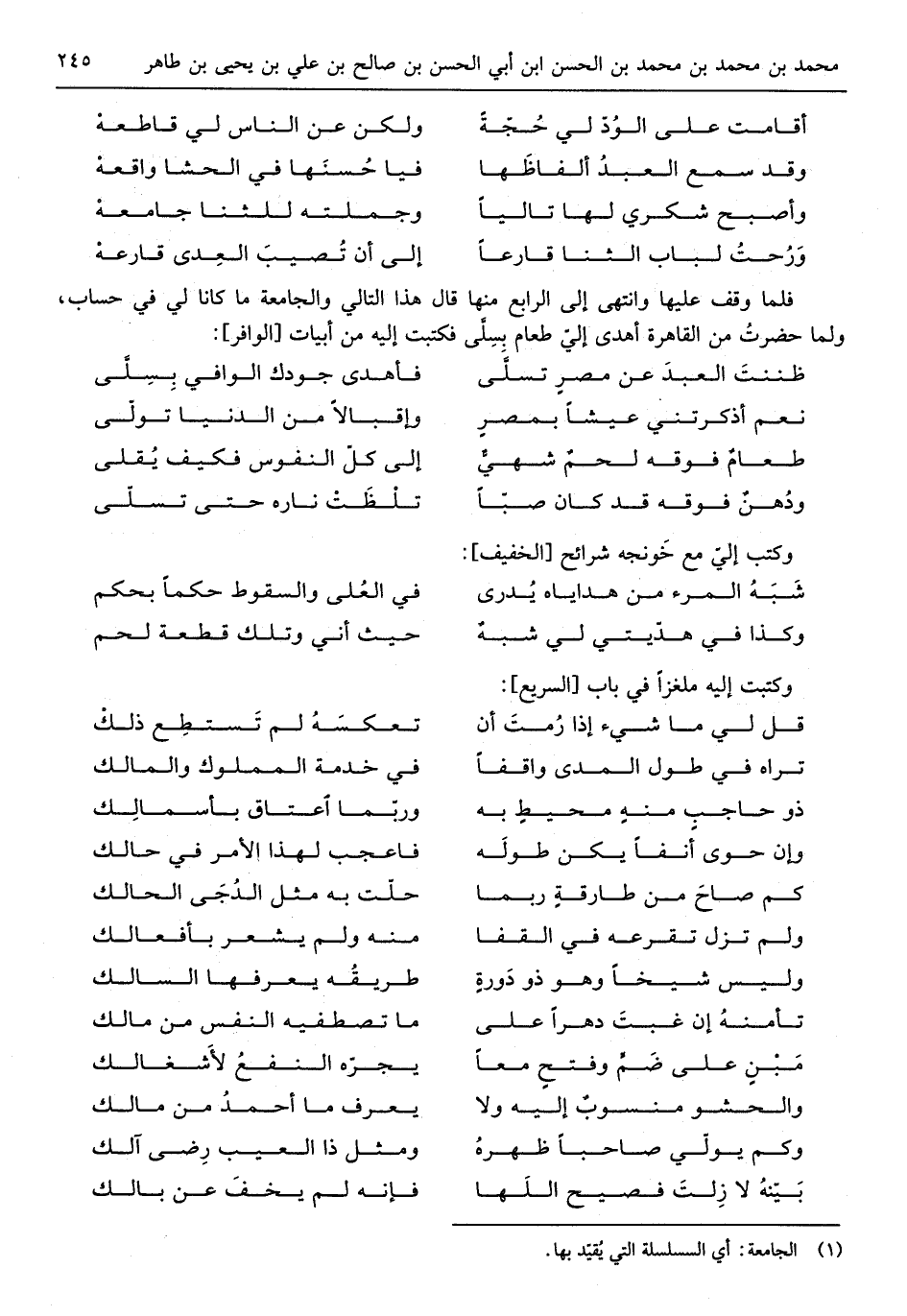 (وَأصْبح شكري لَهَا تالياً ... وَجُمْلَته للثنا جَامعه)