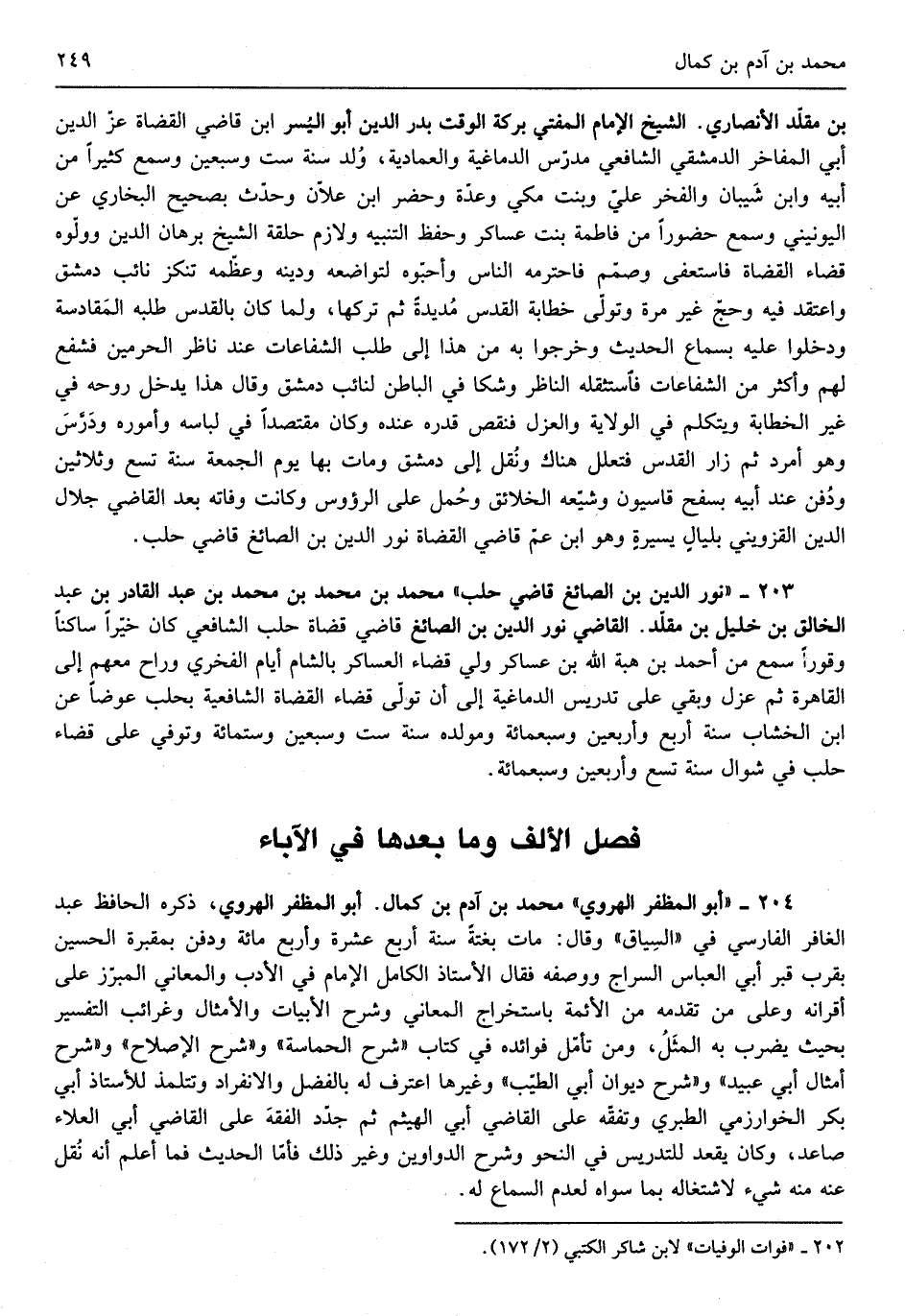 ابْن كَمَال أَبُو المظفر الْهَرَوِيّ ذكره الْحَافِظ عبد الغافر الْفَارِسِي فِي السِّيَاق وَقَالَ مَاتَ بَغْتَة سنة أَربع عشرَة وَأَرْبع مائَة وَدفن بمقبرة الْحُسَيْن بِقرب قبر أبي الْعَبَّاس السراج وَوَصفه فَقَالَ الاستاذ الْكَامِل الإِمَام فِي الْأَدَب والمعاني المبرز على أقرانه وعَلى من تقدمه من الْأَئِمَّة باستخراج الْمعَانِي وَشرح الأبيات والأمثال وغرائب التَّفْسِير بِحَيْثُ يضْرب بِهِ الْمثل وَمن تَأمل فَوَائده فِي كتاب شرح الحماسة وَشرح الْإِصْلَاح وَشرح أَمْثَال أبي عبيد وَشرح ديوَان أبي الطّيب وَغَيرهَا اعْترف لَهُ بِالْفَضْلِ والانفراد وتتلمذ للاستاذ أبي بكر الْخَوَارِزْمِيّ الطَّبَرِيّ وتفقه على القَاضِي أبي الْهَيْثَم ثمَّ جدد الْفِقْه على القَاضِي أبي الْعَلَاء صاعد وَكَانَ يقْعد للتدريس فِي النَّحْو وَشرح الدَّوَاوِين وَغير ذَلِك فَأَما الحَدِيث فَمَا أعلم أَنه نقل عَنهُ مِنْهُ شَيْء لاشتغاله بِمَا سواهُ لعدم السماع لَهُ