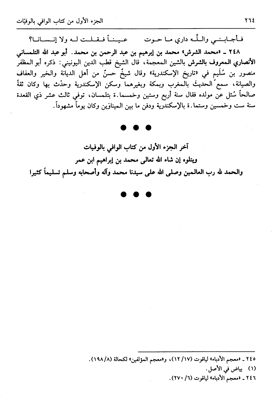 ابْن مُحَمَّد أَبُو عبد الله التلمساني الْأنْصَارِيّ الْمَعْرُوف بالشرش بالشين الْمُعْجَمَة قَالَ الشَّيْخ قطب الدّين اليونيني ذكره أَبُو المظفر مَنْصُور بن سليم فِي تَارِيخ الاسكندرية وَقَالَ شيخ حسن من أهل الدّيانَة وَالْخَيْر والعفاف والصيانة سمع الحَدِيث بالمغرب وبمكة وبغيرهما وَسكن الاسكندرية وَحدث بهَا وَكَانَ ثِقَة صَالحا سُئِلَ عَن مولده فَقَالَ سنة أَربع وَسِتِّينَ وَخمْس مائَة بتلمسان توفّي ثَالِث عشر ذِي الْقعدَة سنة سِتّ وَخمسين وست مائَة بالاسكندرية وَدفن مَا بَين الميناوين وَكَانَ يَوْمًا مشهودا آخر الْجُزْء الأول من كتاب الوافي بالوفيات ويتلوه إِن شَاءَ الله تَعَالَى مُحَمَّد بن إِبْرَاهِيم ابْن عمر وَالْحَمْد لله رب الْعَالمين وَصلى الله على سيدنَا مُحَمَّد وَآله وَأَصْحَابه وَسلم تَسْلِيمًا كثيرا