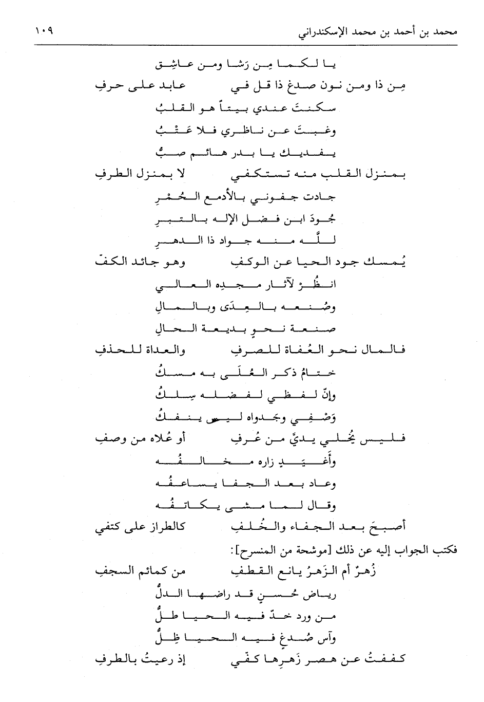 ختام ذكر الْعلي بِهِ مسك وان لَفْظِي لفضله سلك وصفي وجدواه لَيْسَ يَنْفَكّ فَلَيْسَ يخلى يدايمن عرفأو علاهُ من وصف وأغيد زَارَهُ مخالفه وَعَاد بعد الجفا يساعفه وَقَالَ لما مَشى يكاثفه)