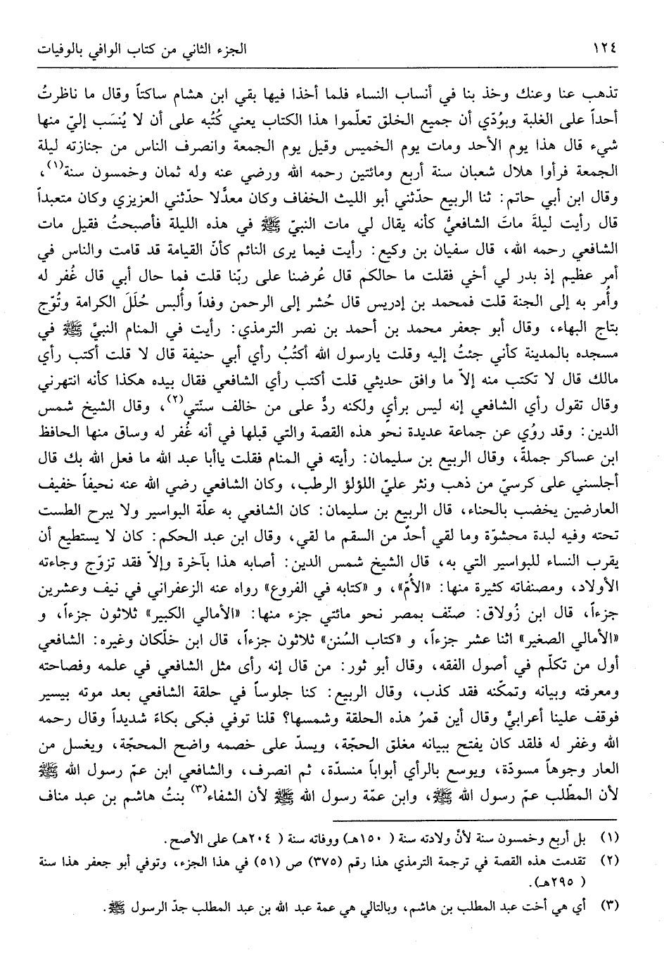 تذْهب عَنَّا وعنا وَخذ بِنَا فِي أَنْسَاب النِّسَاء فَلَمَّا أخذا فِيهَا بَقِي ابْن هِشَام ساكتاً وَقَالَ مَا ناظرت أحدا على الْغَلَبَة وبودي أَن جَمِيع الْخلق تعلمُوا هَذَا الْكتاب يعْنى كتبه على أَن لَا ينْسب إِلَى مِنْهَا شَيْء قَالَ هَذَا يَوْم الْأَحَد وَمَات يَوْم الْخَمِيس وَقيل يَوْم الْجُمُعَة وأنصرف النَّاس من جنَازَته لَيْلَة الْجُمُعَة فَرَأَوْا هِلَال شعْبَان سنة أَربع وماتين رَحمَه الله وَرَضي عَنهُ وَله ثَمَان وَخَمْسُونَ سنة وَقَالَ ابْن أبي حَاتِم ثَنَا الرّبيع حَدثنِي أَبُو اللَّيْث الْخفاف وَكَانَ معدلا حَدثنِي العزيزي وَكَانَ متعبداً قَالَ رَأَيْت لَيْلَة مَاتَ الشَّافِعِي كَأَنَّهُ يُقَال لي مَاتَ النَّبِي صلى الله عَلَيْهِ وَسلم فِي هَذِه اللَّيْلَة فَأَصْبَحت فَقيل مَاتَ الشَّافِعِي رَحمَه الله قَالَ سفين بن وَكِيع رَأَيْت فِيمَا يرى النايم كَانَ الْقِيَامَة قد قَامَت وَالنَّاس فِي أَمر عَظِيم إِذا بدر لي أخي فَقلت مَا حالكم قَالَ عرضنَا على رَبنَا قلت فَمَا حَال أبي قَالَ غفر لَهُ وَأمر بِهِ إِلَى الْجنَّة قلت فمحمد بن أدريس قَالَ حشر إِلَى الرَّحْمَن وَفْدًا وألبس حلل الْكَرَامَة وتوج بتاج الْبَهَاء وَقَالَ أَبُو جَعْفَر مُحَمَّد بن أَحْمد بن نصر التِّرْمِذِيّ رَأَيْت فِي الْمَنَام النَّبِي صلى الله عَلَيْهِ وَسلم فِي مَسْجده بِالْمَدِينَةِ كَأَنِّي جِئْت إِلَيْهِ وَقلت يرسول الله أكتب رأى أبي حنيفَة قَالَ لَا قلت أكتب رأى مَالك قَالَ لَا تكْتب مِنْهُ إِلَّا مَا وَافق حَدِيثي قلت)