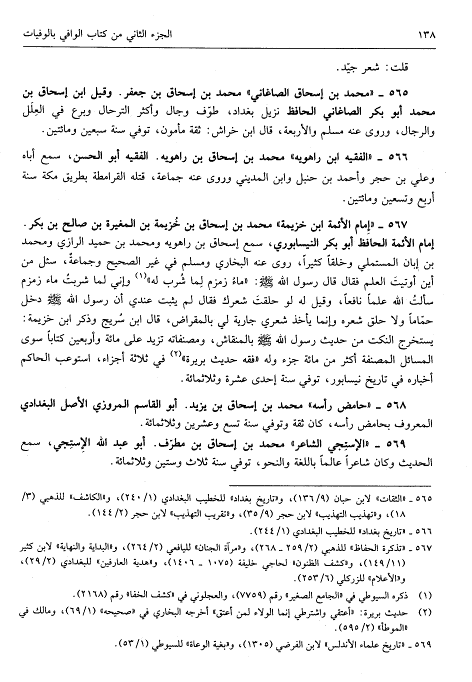 وَلَا حلق شعره وَإِنَّمَا يَأْخُذ شعرى جَارِيَة لي بالمقراض قَالَ ابْن سُرَيج وَذكر ابْن خُزَيْمَة يسْتَخْرج النكت من حَدِيث رَسُول الله صلى الله عَلَيْهِ وَسلم بالمنقاش ومصنافه تزيد على ماية وَأَرْبَعين كتابا سوى المسايل المصنفة أَكثر من ماية جُزْء وَله فقه حَدِيث بَرِيرَة فِي ثلثة أَجزَاء استوعب الْحَاكِم أخباره فِي تَارِيخ نيسابور توفى سنة إِحْدَى عشرَة وَثلث ماية
