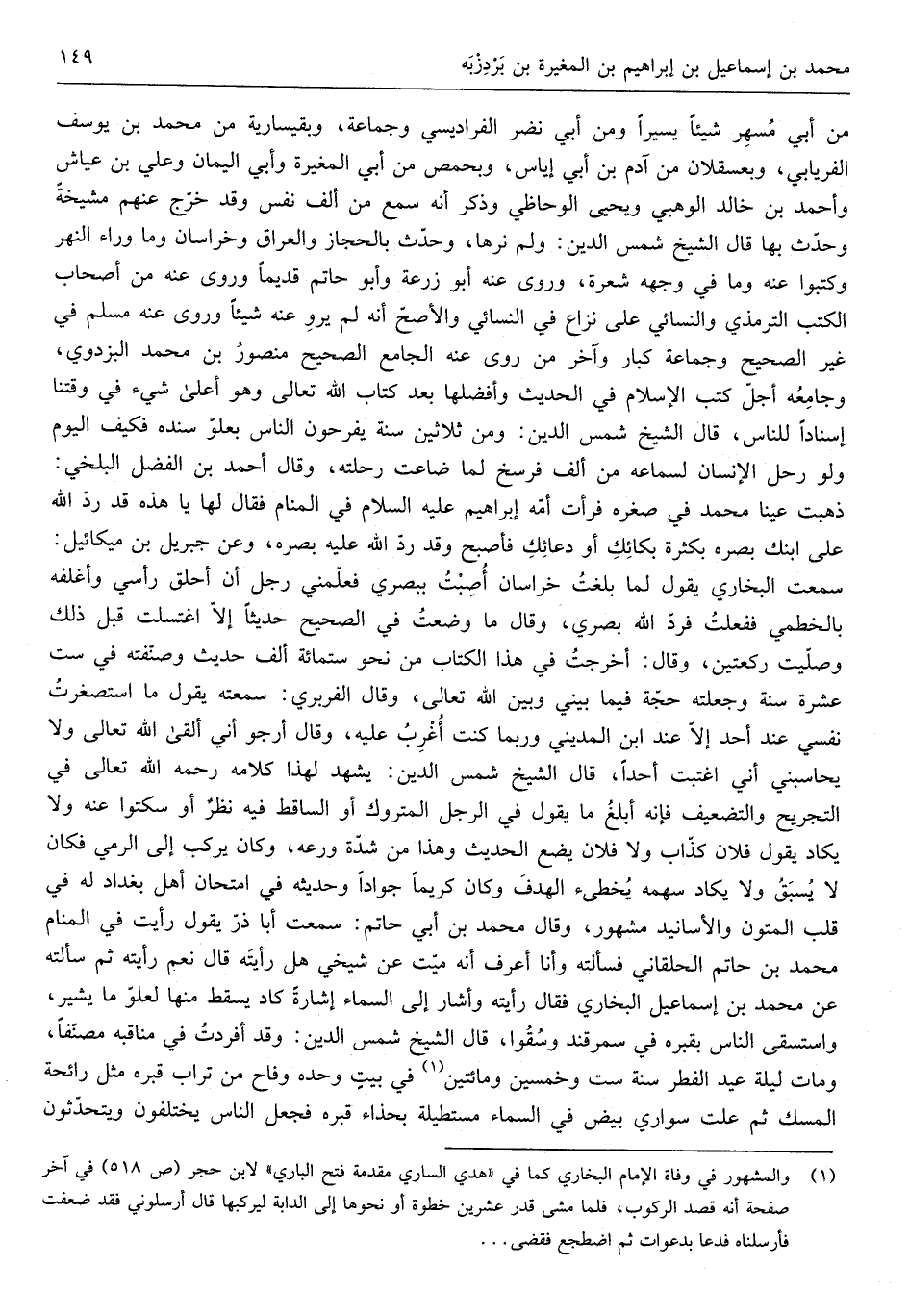 عَلَيْهِ بَصَره وَعَن جِبْرِيل بن مِيكَائِيل سَمِعت البُخَارِيّ يَقُول لما بلغت خُرَاسَان أصبت ببصرى فعلمني رجل أَن احْلق رَأْسِي واغلفه بالخطمى فَفعلت فَرد الله بصرى وَقَالَ مَا وضعت فِي الصَّحِيح حَدِيثا إِلَّا اغْتَسَلت قبل ذَلِك وَصليت رَكْعَتَيْنِ وَقَالَ أخرجت فِي هَذَا الْكتاب من نَحْو سِتّ ماية ألف حَدِيث وصنفته فِي سِتّ عشرَة سنة وَجَعَلته حجَّة فِيمَا بيني وَبَين الله تَعَالَى وَقَالَ الفربرى سمعته يَقُول مَا ساتصغرت نَفسِي عِنْد أحد إِلَّا عِنْد ابْن الْمَدِينِيّ وَرُبمَا كنت اغرب عَلَيْهِ وَقَالَ أَرْجُو أَنِّي القى الله تَعَالَى وَلَا يحاسبني أَنِّي اغتبت أحدا قَالَ الشَّيْخ شمس الدّين يشْهد لهَذَا كَلَامه رَحمَه الله تَعَالَى فِي التجريح والتضعيف فَإِنَّهُ ابلغ مَا يَقُول فِي الرجل الْمَتْرُوك أَو السَّاقِط فِيهِ نظر أَو سكتوا عَنهُ وَلَا يكَاد يَقُول فلَان كَذَّاب وَلَا فلَان يضع الحَدِيث وَهَذَا من شدَّة ورعه وَكَانَ يركب إِلَى الرمى فَكَانَ لَا يسْبق وَلَا يكَاد سَهْمه يُخطئ الهدف وَكَانَ كَرِيمًا جوادا وَحَدِيثه فِي امتحان أهل بَغْدَاد لَهُ فِي قلب الْمُتُون والأسانيد مَشْهُور وَقَالَ مُحَمَّد بن أبي حَاتِم سَمِعت أَبَا ذَر يَقُول رَأَيْت فِي الْمَنَام مُحَمَّد بن حَاتِم الحلقاني فَسَأَلته وَأَنا أعرف أَنه ميت عَن شَيْخي هَل رَأَيْته قَالَ نعم رَأَيْته ثمَّ سَأَلته عَن مُحَمَّد بن اسمعيل البُخَارِيّ فَقَالَ رَأَيْته أَشَارَ إِلَى السَّمَاء إِشَارَة كَاد يسْقط مِنْهَا لعلو مَا يُشِير واستسقى النَّاس بقبره فِي سَمَرْقَنْد وَسقوا قَالَ لشيخ شمس الدّين وَقد افردت فِي مناقبه مصنفا وَمَات لَيْلَة عيد الْفطر سنة سِتّ وَخمسين وماتين فِي بَيت وَحده وفاح من تُرَاب قَبره مثل رايحة الْمسك ثمَّ علت سوارى بيض فِي السَّمَاء مستطيلة بحذاء قَبره فَجعل النَّاس يَخْتَلِفُونَ وَيَتَحَدَّثُونَ