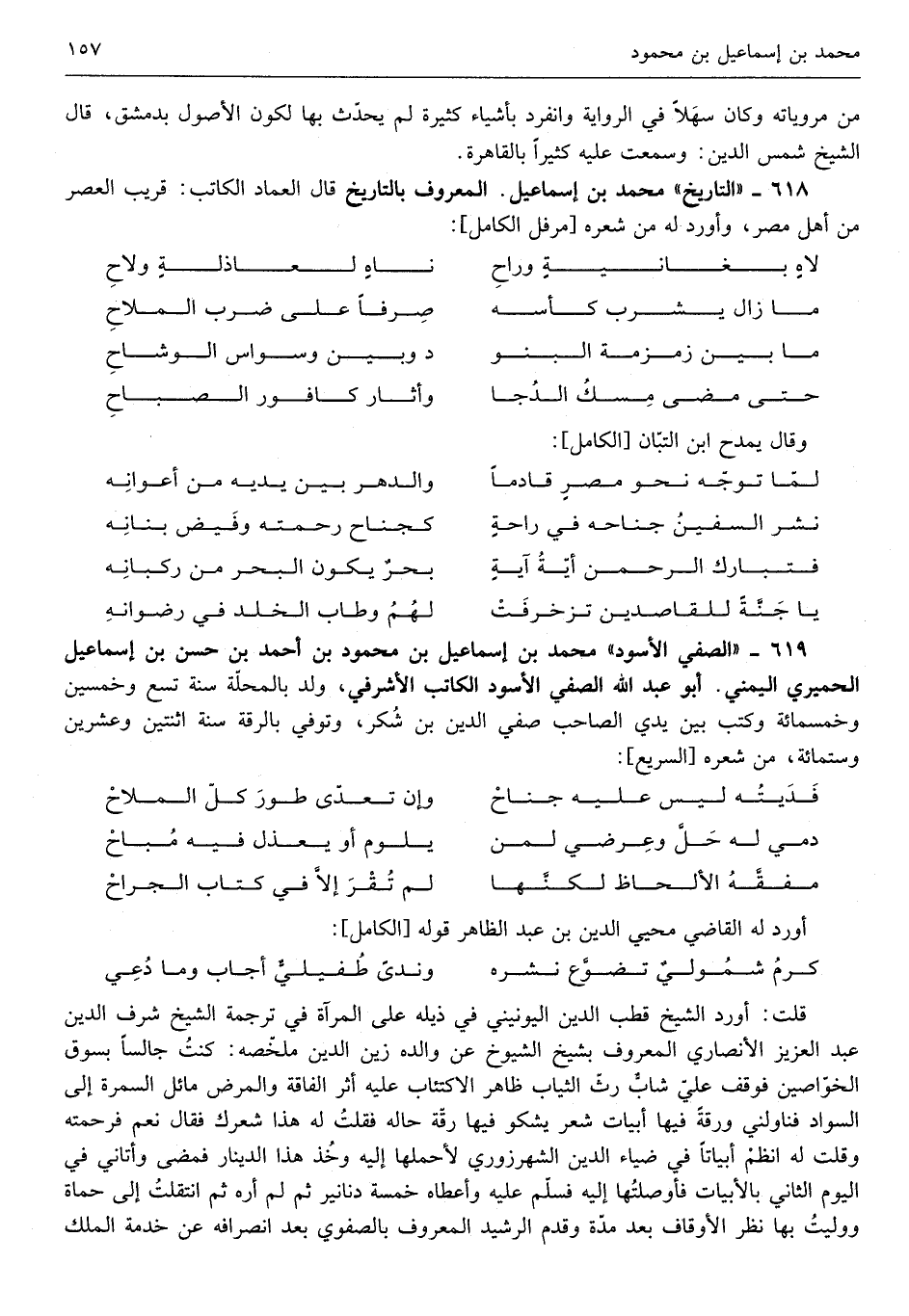 من مروياته وَكَانَ سهلا فِي الرِّوَايَة وَانْفَرَدَ بأَشْيَاء كَثِيرَة لم يحدث بهَا لكَون الْأُصُول بِدِمَشْق قَالَ الشَّيْخ شمس الدّين وَسمعت عَلَيْهِ كثيرا بِالْقَاهِرَةِ التَّارِيخ مُحَمَّد بن اسمعيل الْمَعْرُوف بالتاريخ قَالَ الْعِمَاد الْكَاتِب قريب الْعَصْر من أهل مصر وَأورد لَهُ من شعره