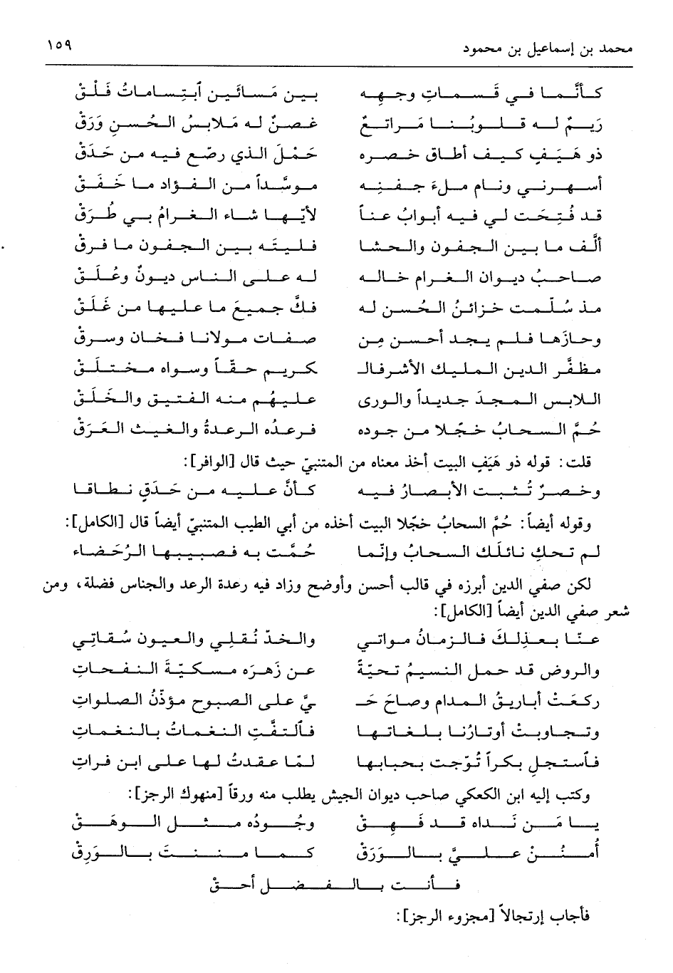 لَكِن صفى الدّين أبرزه فِي قالب أحسن وأوضح وَزَاد فِيهِ رعدة الرَّعْد والجناس فضلَة وَمن شعر صفى الدّين أَيْضا