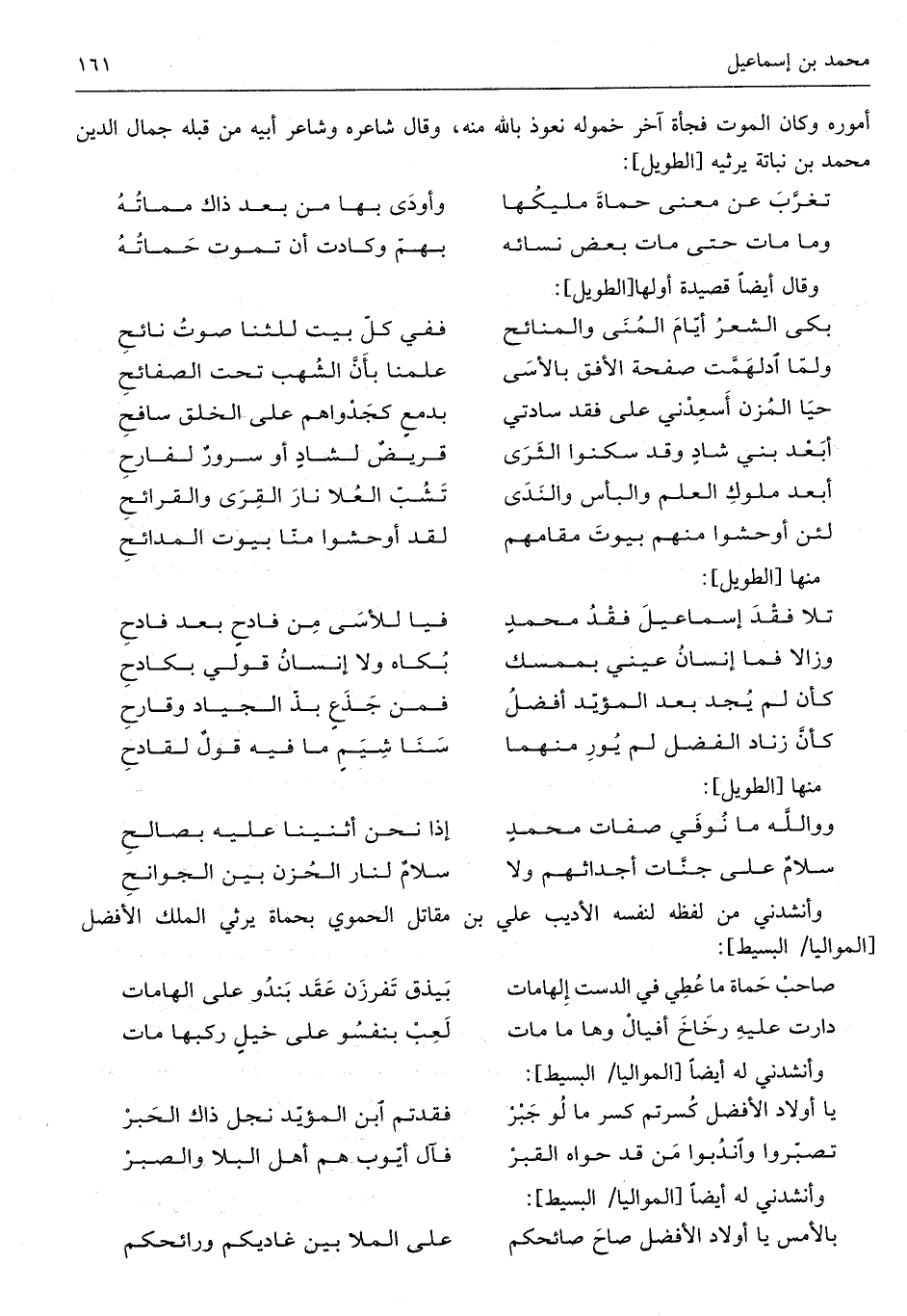 أُمُوره وَكَانَ الْمَوْت فجاءة آخر خموله نَعُوذ بِاللَّه مِنْهُ وَقَالَ شاعره وشاعر أَبِيه من قبل جمال الدّين مُحَمَّد بن نباتة يرثيه