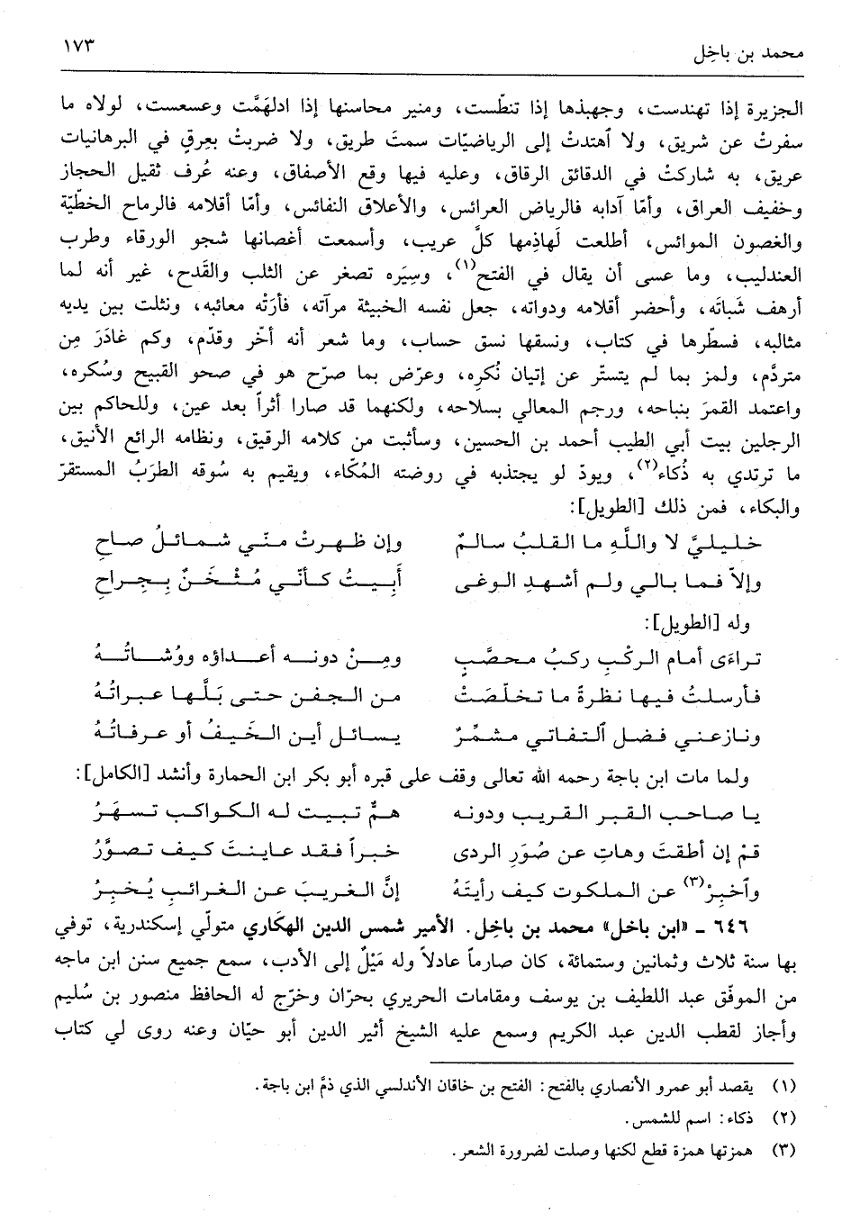 الجزيرة إِذا تهندست وجهبذها إِذا تنطست ومنير محاسنها إِذا ادلهمت وعسعست لولاه مَا سفرت عَن شريق وَلَا اهتدت إِلَى الرياضيات سمت طَرِيق وَلَا ضربت بعرق فِي البرهانيات عريق بِهِ شاركت فِي الدقايق الرقَاق وَعَلِيهِ فِيهَا وَقع الآصفاق وَعنهُ عرف ثقيل الْحجاز وخفيف الْعرَاق وَأما آدابه فالرياض العرايس والاعلاق النفايس وَأما أقلامه فالرماح الخطية والغصون الموايس اطَّلَعت لهاذمها كل عريب واسمعت اغصانها شجو الورقاء وطرب العندليب وَمَا عَسى أَن يُقَال فِي الْفَتْح وسيره تصغر عَن الثلب والقدح غير أَنه لما ارهف شباته واحضر أقلامه ودواته جعل نَفسه الخبيثة مرآته فأردته معايبه ونثلت بَين يَدَيْهِ مثالبة فسطرها فِي كتاب ونسقها نسق حِسَاب وَمَا شعر أَنه أخر وَقدم وَكم غادر من متردم ولمز بِمَا لم يتستر عَن اتيان نكره وَعرض بِمَا صرح هُوَ فِي صحو الْقَبِيح وسكره وَاعْتمد الْقَمَر بنباحه ورجم الْمَعَالِي بسلاحه ولكنهما قد صَارا أثرا بعد عين وللحاكم بَين الرجلَيْن بَيت أبي الطّيب أَحْمد بن الْحُسَيْن وسأثبت من كَلَامه الرَّقِيق ونظامه الرايع الأنيق مَا ترتدي بِهِ ذكاء وَيَوَد لَو يجتذبه فِي روضته المكاء وَيُقِيم بِهِ سوقه الطَّرب المستقر والبكاء فَمن ذَلِك