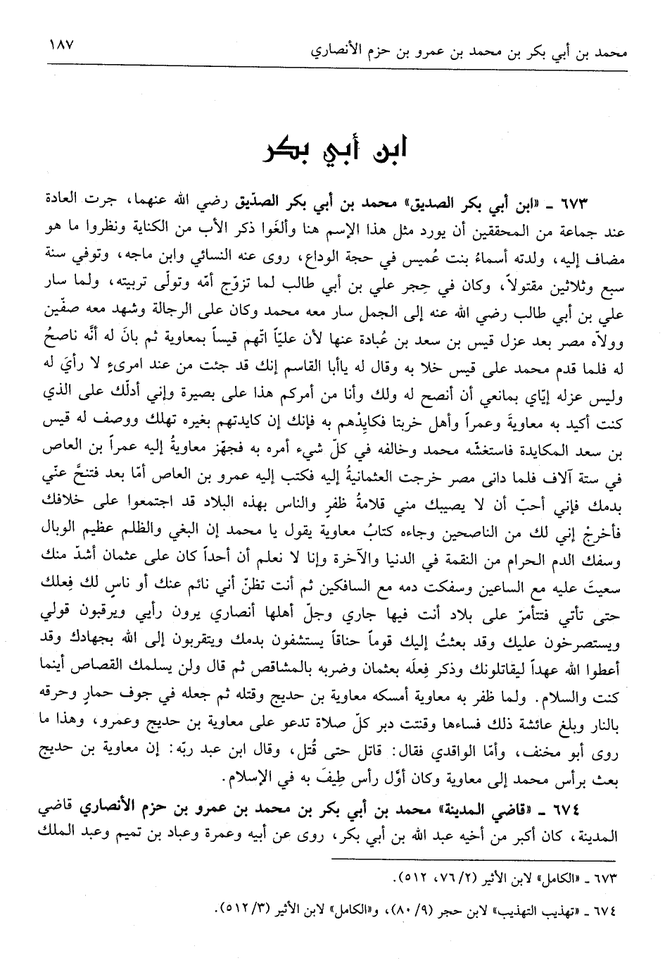 ابْن أبي بكر الصّديق مُحَمَّد بن أبي بكر الصّديق رَضِي الله عَنْهُمَا جرت الْعَادة عِنْد جمَاعَة من الْمُحَقِّقين أَن يُورد مثل هَذَا الأسم هُنَا والغوا ذكر الْأَب من الْكِنَايَة ونظروا مَا هُوَ مُضَاف إِلَيْهِ وَلدته أَسمَاء بنت عُمَيْس فِي حجَّة الْوَدَاع روى عَنهُ النَّسَائِيّ وَابْن ماجة وَتُوفِّي سنة سبع وثلثين مقتولا وَكَانَ فِي حجر عَليّ بن أبي طَالب لما تزوج أمه وَتَوَلَّى تَرْبِيَته وَلما سَار عل بن أبي طَالب رَضِي الله عَنهُ إِلَى الْجمل سَار مَعَه مُحَمَّد وَكَانَ على الرجالة وَشهد مَعَه صفّين وولاه مصر بعد عزل قيس بن سعد بن عبَادَة عَنْهَا لآن عليا اتهمَ قيسا بمعوية ثمَّ بَان لَهُ أَنه نَاصح لَهُ فَلَمَّا قدم مُحَمَّد على قيس خلابه وَقَالَ لَهُ يابا الْقسم أَنَّك قد جِئْت من عِنْد امرء لَا رَأْي لَهُ وَلَيْسَ عَزله إيَّايَ بمانعي أَن انصح لَهُ وَلَك وَأَنا من أَمركُم هَذَا على بَصِيرَة وَأَنِّي ادلك على الَّذِي كنت أكيد بِهِ معوية وعمرا وَأهل خربتا فكايدهم بِهِ فأنك أَن كايدتهم بِغَيْرِهِ تهْلك وَوصف لَهُ قيس بن سعد المكايدة فاستغشه مُحَمَّد وَخَالفهُ فِي كل شىء امْرَهْ بِهِ فَجهز معوية إِلَيْهِ عمرا ابْن الْعَاصِ فِي سِتَّة آلَاف فَلَمَّا دانى مصر خرجت العثمانية إِلَيْهِ فَكتب إِلَيْهِ عَمْرو بن الْعَاصِ أما بعد فتنح عني بدمك فَإِنِّي أحب أَن لَا يصيبك مني قلامة ظفر وَالنَّاس بِهَذِهِ الْبِلَاد قد اجْتَمعُوا على خِلافك فَاخْرُج أَنِّي لَك من الناصحين وجاءه كتاب معوية يَقُول يَا مُحَمَّد أَن الْبَغي وَالظُّلم عَظِيم الوبال وَسَفك الدَّم الْحَرَام من النقمَة فِي الدُّنْيَا وَالْآخِرَة وَأَنا لَا نعلم أَن أحدا كَانَ على عُثْمَان أَشد مِنْك سعيت عَلَيْهِ مَعَ الساعين وسفكت دَمه مَعَ السافكين ثمَّ أَنْت تظن أَنِّي نايم عَنْك أَو نَاس لَك فعلك حَتَّى تَأتي فتتأمر على بِلَاد أَنْت فِيهَا جارى وَجل أَهلهَا انصارى يرَوْنَ رَأْيِي ويرقبون قولى ويستصرخون عَلَيْك وَقد بعثت إِلَيْك قوما حناقا يستشفون بدمك ويتقربون إِلَى الله بجهادك وَقد اعطوا الله عهدا ليقاتلونك وَذكر فعله بعثمان وضربه بالمشاقص ثمَّ قَالَ وَلنْ يسلمك الْقصاص أَيْنَمَا كنت وَالسَّلَام وَلما ظفر بِهِ معوية امسكه معوية بن حديج وَقَتله ثمَّ جعله فِي جَوف حمَار وَحَرقه بالنَّار وَبلغ عايشة ذَلِك فساءها وقنتت دبر كل صَلَاة تَدْعُو على معوية بن حديج وَعَمْرو وَهَذَا مَا روى أَبُو مخنف وَأما الْوَاقِدِيّ فَقَالَ قَاتل حَتَّى قتل وَقَالَ ابْن عبد ربه أَن معوية بن حديج بعث بِرَأْس مُحَمَّد إِلَى معوية وَكَانَ أول رَأس طيف بِهِ فِي الْإِسْلَام
