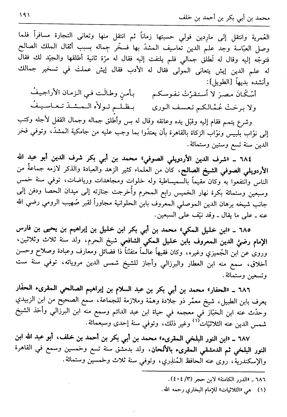 ابْن خَلِيل الْمَكِّيّ مُحَمَّد بن أبي بكر بن خَلِيل بن إِبْرَاهِيم بن يحيى ابْن فَارس الإِمَام رضى الدّين الْمَعْرُوف بِابْن خَلِيل الْمَكِّيّ الشَّافِعِي شيخ الْحرم ولد سنة ثلث وثلثين وروى عَن ابْن الجميزى وَغَيره وَكَانَ فَقِيها عَالما متفننا ذَا فضايل ومعارف وَعبادَة وَصَلَاح وَحسن أَخْلَاق سمع مِنْهُ ابْن الْعَطَّار البرزالي وَأَجَازَ للشَّيْخ شمس الدّين مروياته توفّي سنة سِتّ وَتِسْعين وست ماية)