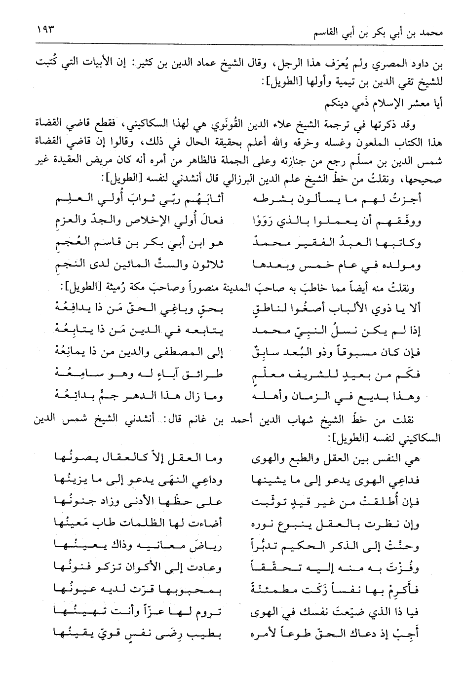 بن دَاوُد الْمصْرِيّ لم يعرف هَذَا الرجل وَقَالَ لشيخ عماد الدّين بن كثير أَن الأبيات الَّتِي كتبت للشَّيْخ تَقِيّ الدّين ابْن تَيْمِية وأولها أيا معشر الْإِسْلَام ذمِّي دينكُمْ وَقد ذكرتها فِي تَرْجَمَة الشَّيْخ عَلَاء الدّين القونوى هِيَ لهَذَا السكاكيني فَقطع قَاضِي الْقُضَاة هَذَا الْكتاب الملعون وغسله وخرقه وَالله اعْلَم بِحَقِيقَة الْحَال فِي ذلكن وَقَالُوا أَن قَاضِي الْقُضَاة شمس الدّين ابْن مُسلم رَجَعَ من جنَازَته وعَلى الْجُمْلَة فَالظَّاهِر من امْرَهْ أَنه كَانَ مَرِيض العقيدة غير صحيحها ونقلت من خطّ الشَّيْخ علم الدّين البرزالي قَالَ أَنْشدني لنَفسِهِ