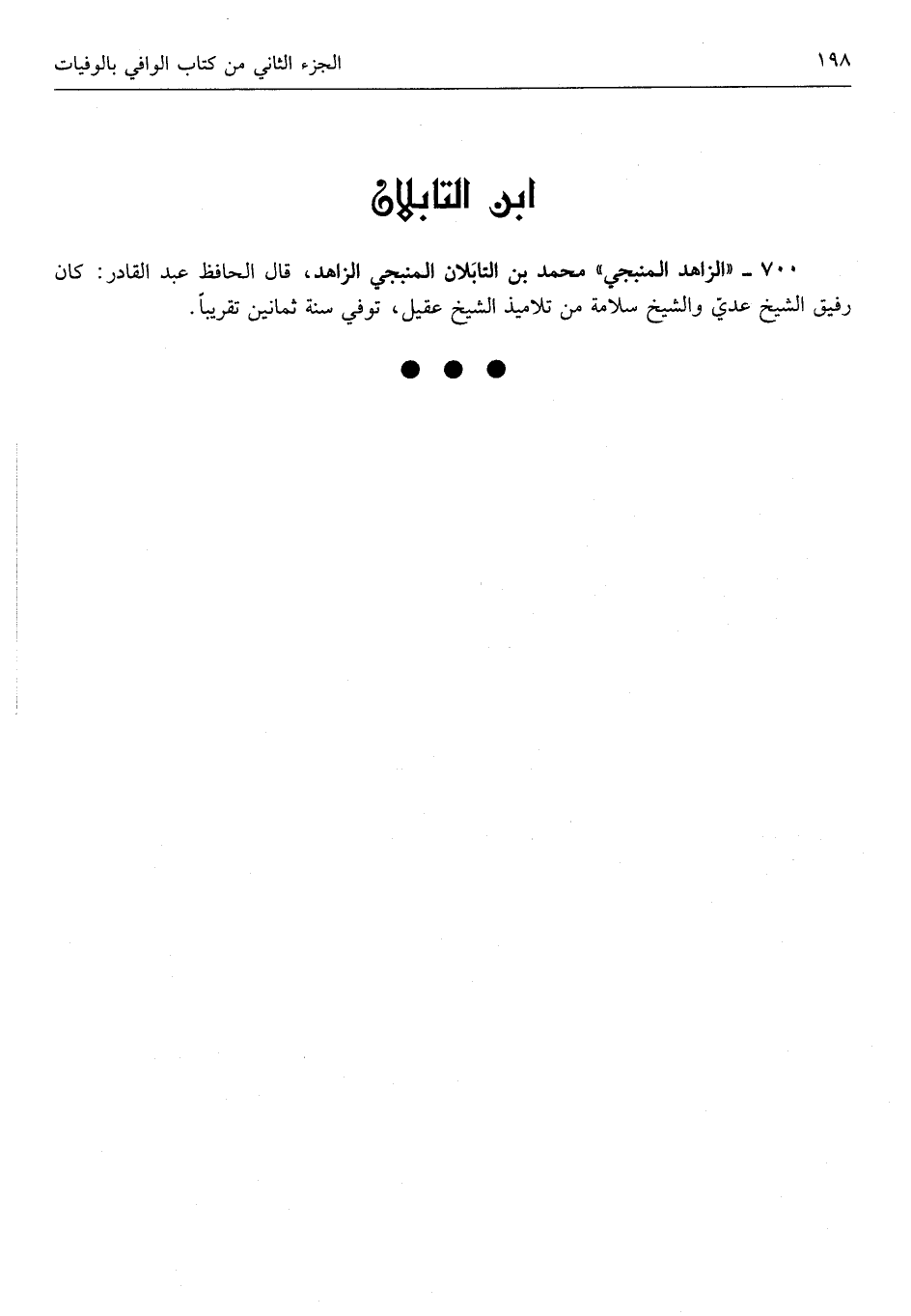 الزَّاهِد المنبجي مُحَمَّد بن التابلان المنبجي الزَّاهِد قَالَ الْحَافِظ عبد الْقَادِر كَانَ رَفِيق الشَّيْخ عدى وَالشَّيْخ سَلامَة من تلاميذ الشَّيْخ عقيل توفّي سنة ثَمَانِينَ تَقْرِيبًا