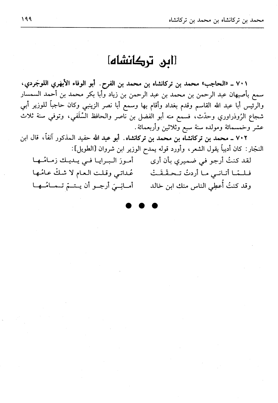 الْحَاجِب مُحَمَّد بن تركانشاه بن مُحَمَّد بن الْفَرح أَبُو الْوَفَاء الْأَبْهَرِيّ اللوجردى سمع بأصبهان عبد الرَّحْمَن بن مُحَمَّد بن عبد الرَّحْمَن بن زِيَاد وَأَبا بكر مُحَمَّد بن أَحْمد السمسار والرئيس أَبَا عبد الله الْقسم وَقدم بَغْدَاد وَأقَام بهَا وَسمع أَبَا نصر الزَّيْنَبِي وَكَانَ حاجبا للوزير أبي شُجَاع الروذراورى وَحدث فَسمع مِنْهُ أَبُو الْفضل ابْن نَاصِر والحافظ السلَفِي وَتُوفِّي سنة ثلث عشرَة وَخمْس ماية ومولده سنة سبع وثلثين وَأَرْبع ماية مُحَمَّد بن تركاتشاه بن مُحَمَّد بن تركانشاه أَبُو عبد الله حفيد الْمَذْكُور آنِفا قَالَ ابْن النجار كَانَ أديباً يَقُول الشّعْر واورد قَوْله يمدح الْوَزير ابْن شرْوَان