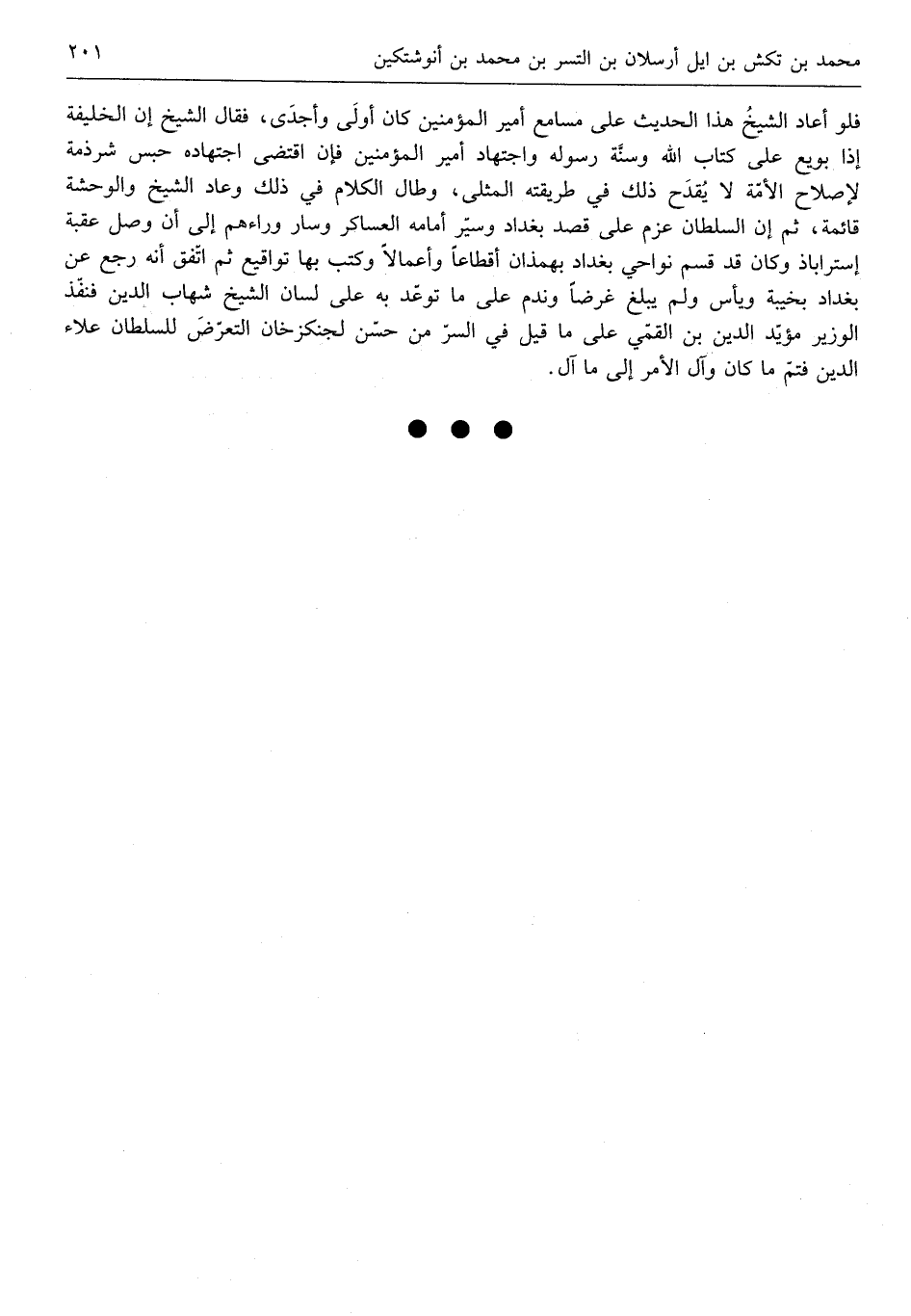 فَلَو أعَاد الشَّيْخ هَذَا الحَدِيث عل مسامع أَمِير الْمُؤمنِينَ كَانَ أولى واجدى فَقَالَ الشَّيْخ أَن الْخَلِيفَة إِذا بُويِعَ على كتاب الله وَسنة رَسُوله واجتهاد أَمِير الْمُؤمنِينَ فَإِن اقْتضى اجْتِهَاده حبس شرذمة لأصلاح الْأمة لَا يقْدَح ذَلِك فِي طَرِيقَته المثلى وَطَالَ الْكَلَام فِي ذَلِك وَعَاد الشَّيْخ والوحشة قايمة ثمَّ أَن السُّلْطَان عزم على قصد بَغْدَاد وسير أَمَامه العساكر وَسَار وَرَاءَهُمْ إِلَى أَن وصل عقبَة استراباذ وَكَانَ قد قسم نواحي بَغْدَاد بهمذان اقطاعا واعمالا وَكتب بهَا تواقيع ثمَّ اتّفق أَنه رَجَعَ عَن بَغْدَاد بخيبة وبأس وَلم يبلغ غَرضا وَنَدم على مَا توعد بِهِ على لِسَان الشَّيْخ شهَاب الدّين فنفذ الْوَزير مؤيد الدّين ابْن القمى على مَا قيل فِي السِّرّ من حسن لجنكزخان التَّعَرُّض للسُّلْطَان عَلَاء الدّين فتم مَا كَانَ وَآل الْأَمر إِلَى مَا آل