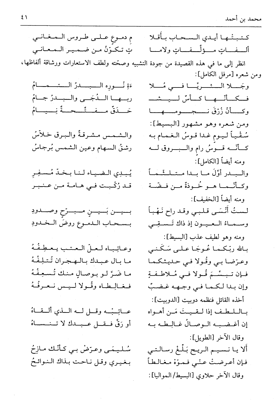 أنظر إِلَى مَا فِي هَذِه القصيدة من جودة التَّشْبِيه وَصِحَّته ولطف الاستعارات ورشاقة ألفاظها وَمن شعره