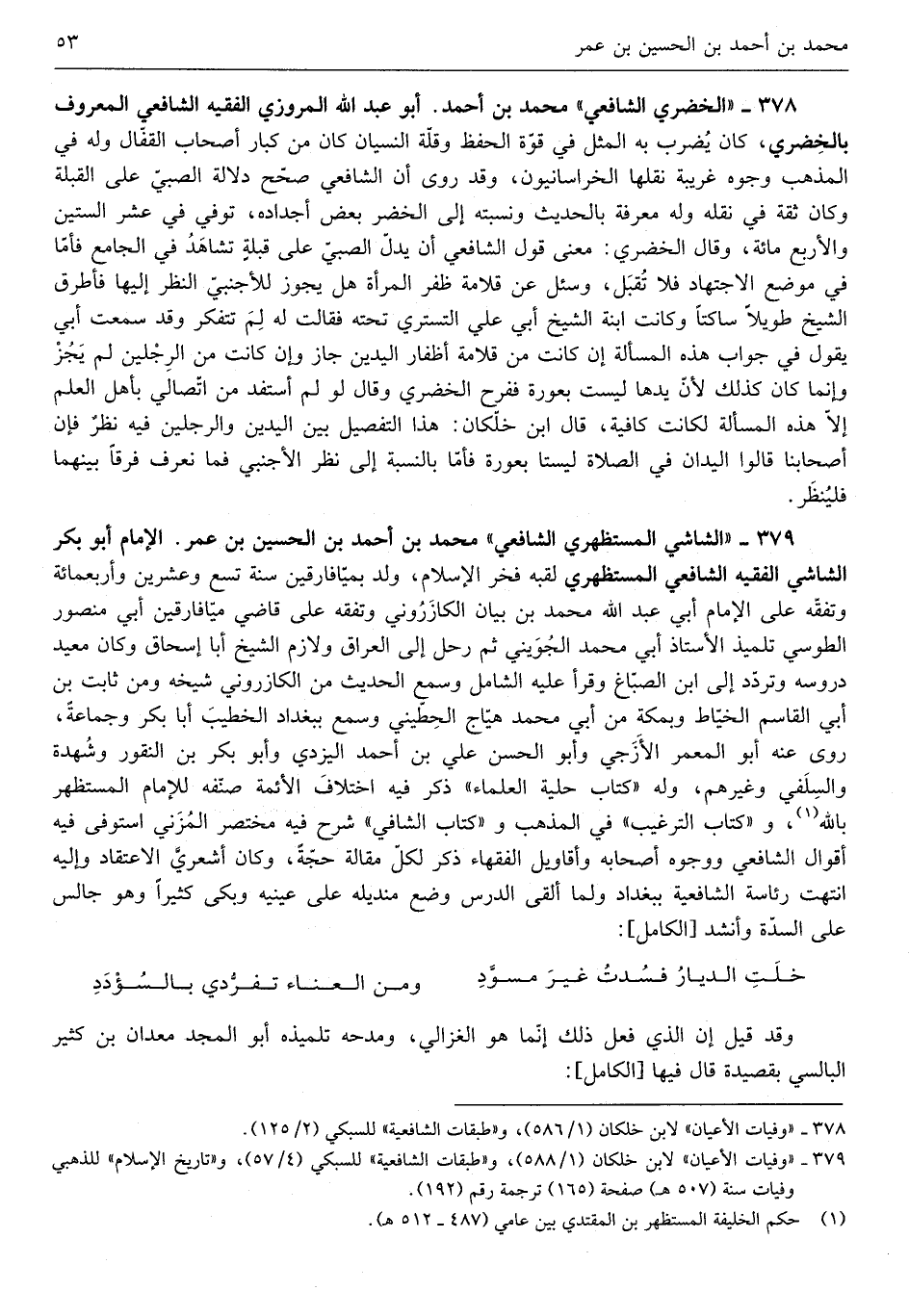 كبار أَصْحَاب الْقفال وَله فِي الْمَذْهَب وُجُوه غَرِيبَة نقلهَا الخراسانيون وَقد روى أَن الشَّافِعِي صحّح دلَالَة الصَّبِي على الْقبْلَة وَكَانَ ثِقَة فِي نَقله وَله معرفَة بِالْحَدِيثِ ونسبته إِلَى الْخضر بعض أجداده توفّي فِي عشر السِّتين والأربع ماية وَقَالَ الخضري معنى قَول الشَّافِعِي أَن يدل الصَّبِي على قبْلَة تشاهد فِي الْجَامِع فَأَما فِي مَوضِع الأجتهاد فَلَا تقبل وَسُئِلَ عَن قلامة ظفر الْمَرْأَة هَل يجوز للْأَجْنَبِيّ النّظر إِلَيْهَا فَأَطْرَقَ الشَّيْخ طَويلا ساكتا وَكَانَت ابْنة الشَّيْخ أبي عَليّ التسترِي تَحْتَهُ فَقَالَت لَهُ لم تتفكر وَقد سَمِعت أبي يَقُول فِي جَوَاب هَذِه الْمَسْأَلَة أَن كَانَت من قلامة أظفار الْيَدَيْنِ جَازَ وَأَن كَانَت من الرجلَيْن لم يجز وأنما كَانَ كَذَلِك لِأَن يَدهَا لَيست بِعَوْرَة ففرح الخضري وَقَالَ لَو لم آستفد من اتصالي بِأَهْل الْعلم إِلَّا هَذِه الْمَسْأَلَة لكَانَتْ كَافِيَة قَالَ ابْن خلكان هَذَا التَّفْصِيل بَين الْيَدَيْنِ وَالرّجلَيْنِ فِيهِ نظر فَإِن أَصْحَابنَا قَالُوا اليدان فِي الصَّلَاة ليستا بِعَوْرَة فَأَما بِالنِّسْبَةِ إِلَى نظر الْأَجْنَبِيّ فَمَا نَعْرِف فرقا بَينهمَا فَلْينْظر الشَّاشِي المستظهري الشَّافِعِي مُحَمَّد بن أَحْمد بن الْحُسَيْن بن عمر الْأَمَام أَبُو بكر الشَّاشِي الْفَقِيه الشَّافِعِي المستظهري لقبه فَخر الأسلام ولد بميافارقين سنة تسع وَعشْرين وَأَرْبع ماية وتفقه على الْأَمَام أبي عبد الله مُحَمَّد بن بيانٍ الكازروني وتفقه على قَاضِي ميافارقين أبي مَنْصُور الطوسي تلميذ الْأُسْتَاذ أبي مُحَمَّد الْجُوَيْنِيّ ثمَّ رَحل إِلَى الْعرَاق ولازم الشَّيْخ أَبَا أسحق وَكَانَ معيد دروسه وَتردد إِلَى ابْن الصّباغ وَقَرَأَ عَلَيْهِ الشَّامِل وَسمع الحَدِيث من الكازروني شَيْخه وَمن ثَابت بن أبي الْقسم الْخياط وبمكة من أبي مُحَمَّد هياج الحطيني وَسمع ببغداذ الْخَطِيب أَبَا بكر وَجَمَاعَة روى عَنهُ أَبُو المعمر الْأَزجيّ وَأَبُو الْحسن عَليّ بن أَحْمد اليزدي وَأَبُو بكر بن النقور وشهدة والسلفي وَغَيرهم وَله كتاب حلية الْعلمَاء ذكر فِيهِ اخْتِلَاف الأيمة صنفه للأمام المستظهر بِاللَّه وَكتاب التَّرْغِيب فِي الْمَذْهَب وَكتاب الشافي شرح فِيهِ مُخْتَصر الْمُزنِيّ استوفي فِيهِ أَقْوَال الشَّافِعِي ووجوه أَصْحَابه وأقاويل الْفُقَهَاء ذكر لكل مقَالَة حجَّة وَكَانَ أشعري الأعتقاد وَإِلَيْهِ انْتَهَت رياسة الشَّافِعِيَّة ببغداذ وَلما القي الدَّرْس وضع منديله على عَيْنَيْهِ وَبكى كثيرا وَهُوَ جَالس على السدة وَأنْشد