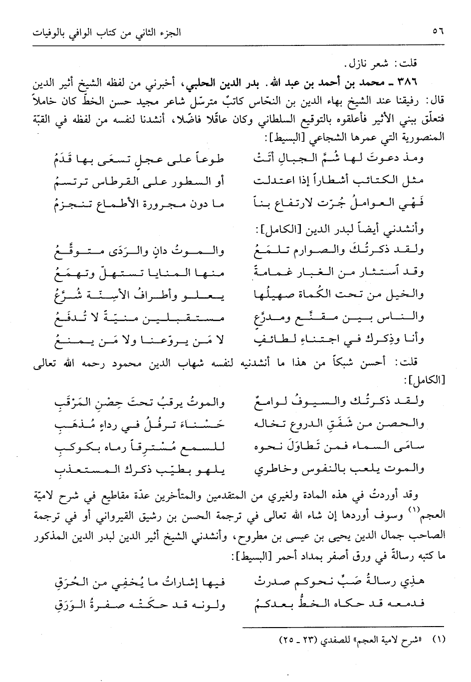 الْعَجم وسوف أوردهَا أَن شَاءَ الله تَعَالَى فِي تَرْجَمَة الْحسن بن رَشِيق القيرواني أَو فِي تَرْجَمَة الصاحب جمال الدّين يحيى بن عِيسَى بن مطروح وأنشدني الشَّيْخ أثير الدّين لبدر الدّين الْمَذْكُور مَا كتبه رِسَالَة فِي ورق أصفر بمداد أَحْمَر