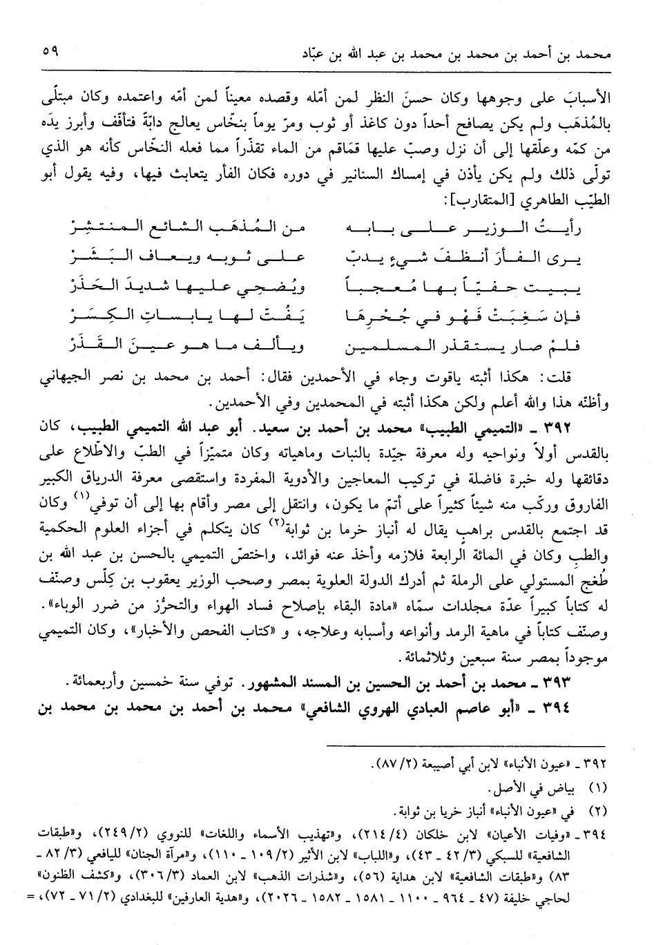 الْحكمِيَّة والطب وَكَانَ فِي الماية الرَّابِعَة فلازمه وَأخذ عَنهُ فوايد واختص التَّمِيمِي بالْحسنِ بن عبد الله بن طعج المستولي على الرملة ثمَّ أدْرك الدولة العلوية بِمصْر وَصَحب الْوَزير يَعْقُوب بن كلس وصنف لَهُ كتابا كَبِيرا عدَّة مجلدات سَمَّاهُ مَادَّة الْبَقَاء بإصلاح فَسَاد الْهَوَاء والتحرز من ضَرَر الوباء وصنف كتابا فِي مَاهِيَّة الرمد وأنواعه وأسبابه وعلاجه وَكتاب الفحص وَالْأَخْبَار وَكَانَ التَّمِيمِي مَوْجُودا بِمصْر سنة سبعين وَثلث ماية مُحَمَّد بن أَحْمد بن الْحُسَيْن