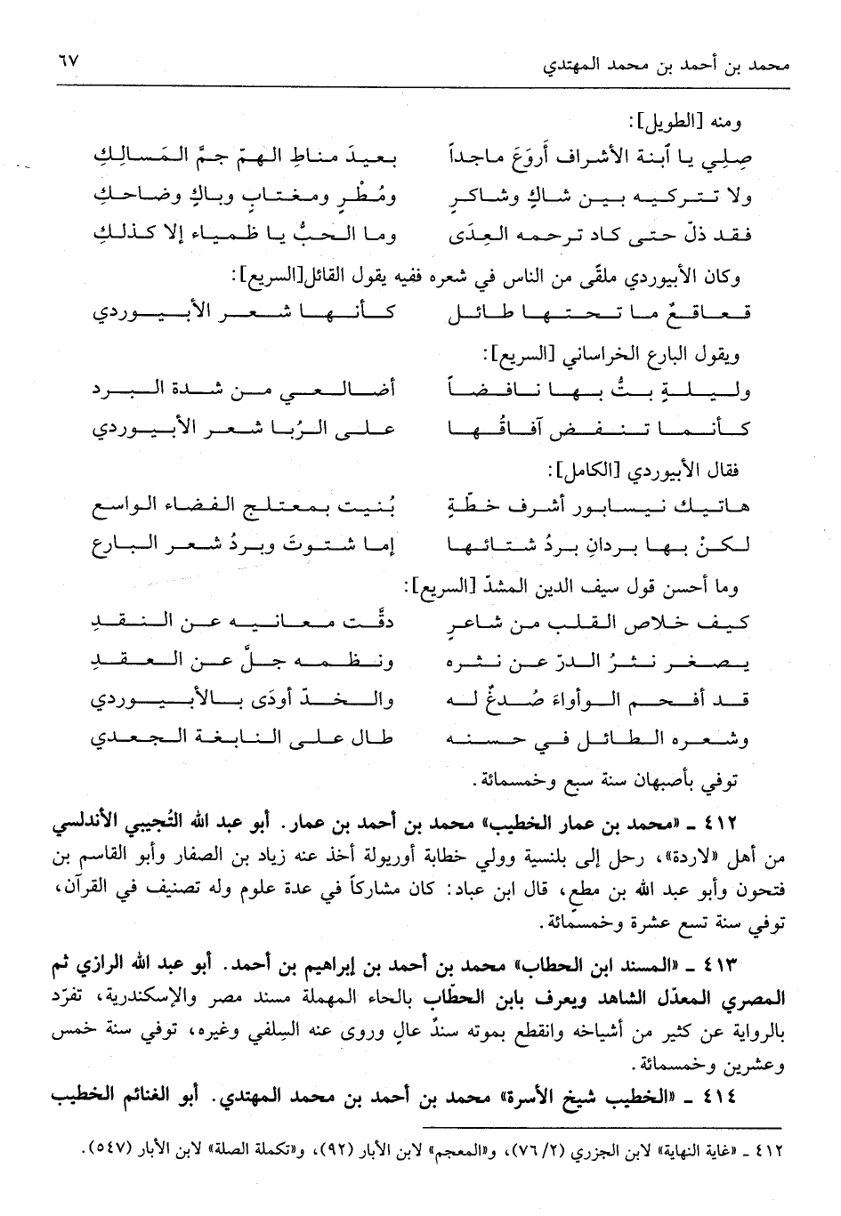 توفّي بأصبهان سنة سبع وَخمْس ماية مُحَمَّد بن عمار الْخَطِيب مُحَمَّد بن أَحْمد بن عمار أَبُو عبد الله التجِيبِي الأندلسي من أهل الأردة رَحل إِلَى بلنسية وَولي خطابة أوريولة أَخذ عَنهُ زِيَاد بن الصفار وَأَبُو الْقسم ابْن فتحون وَأَبُو عبد الله بن مطع قَالَ ابْن عباد كَانَ مشاركا فِي عدَّة عُلُوم وَله تصنيف فِي الْقُرْآن توفّي سنة تسع عشرَة وَخمْس ماية