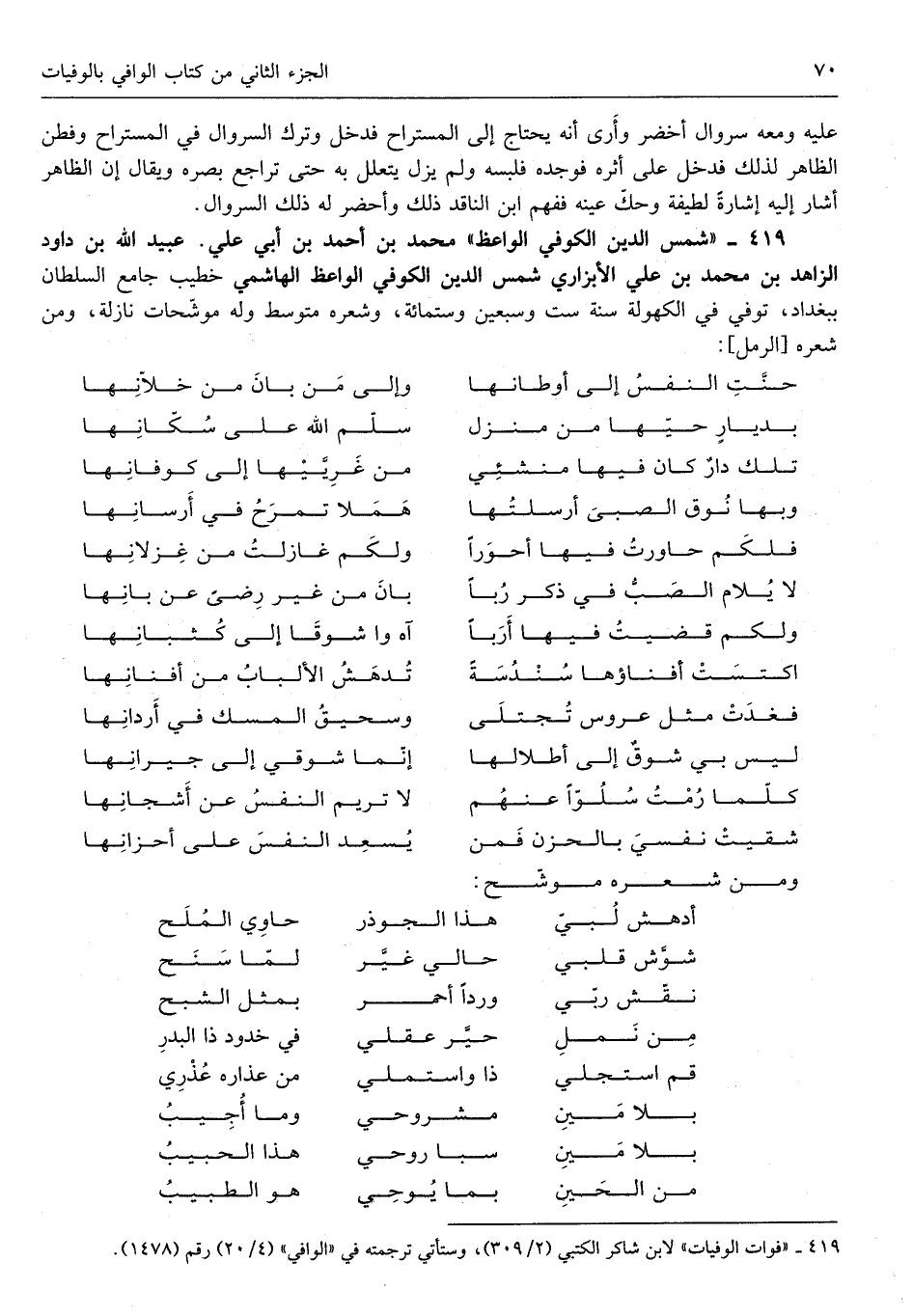 عَلَيْهِ وَمَعَهُ سروال أَخْضَر وَأرى أَنه يحْتَاج إِلَى المستراح فَدخل وَترك السروال فِي المستراح وفطن الظَّاهِر لذَلِك فَدخل على أَثَره فَوَجَدَهُ فلبسه وَلم يزل يتعلل بِهِ حَتَّى تراجع بَصَره وَيُقَال أَن الظَّاهِر أَشَارَ إِلَيْهِ أشارة لَطِيفَة وحك عينه ففهم ابْن النَّاقِد ذَلِك واحضر لَهُ ذَلِك السروال شمس الدّين الْكُوفِي الْوَاعِظ مُحَمَّد بن أَحْمد ابْن أبي عَليّ عبيد الله بن دَاوُد الزَّاهِد بن مُحَمَّد بن عَليّ الْأَبْزَارِيِّ شمس الدّين الْكُوفِي الْوَاعِظ الْهَاشِمِي خطيب جَامع السُّلْطَان ببغداذ توفّي فِي الكهولة سنة سِتّ وَسبعين وست ماية وشعره متوسط وَله موشحات نازلة وَمن شعره