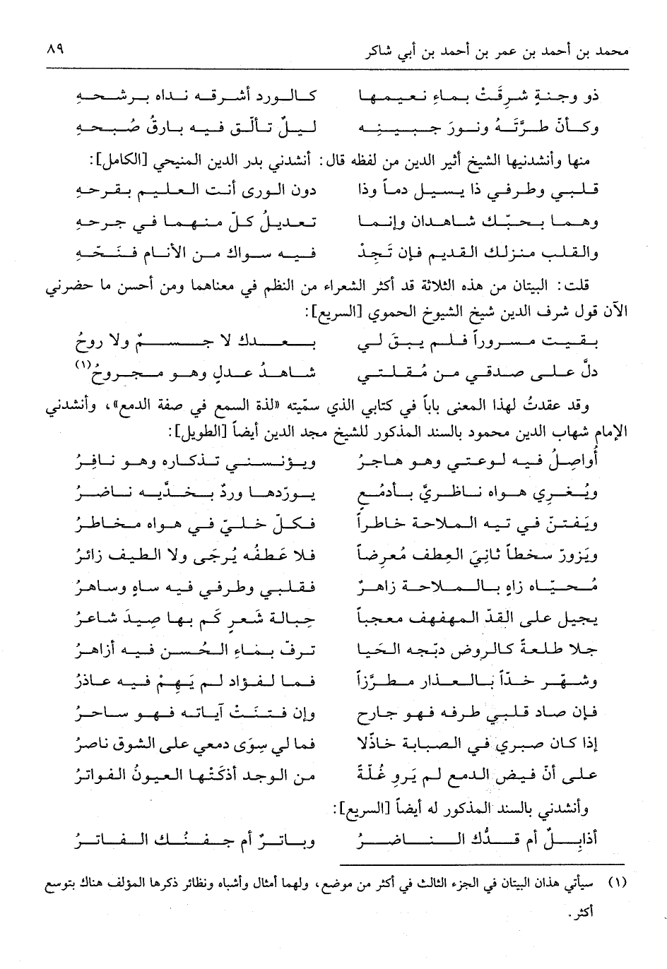 وَقد عقدت لهَذَا الْمَعْنى بَابا فِي كتابي الَّذِي سميته لَذَّة السّمع فِي صفة الدمع وأنشدني الْأَمَام شهَاب الدّين مَحْمُود بالسند الْمَذْكُور للشَّيْخ مجد الدّين أَيْضا