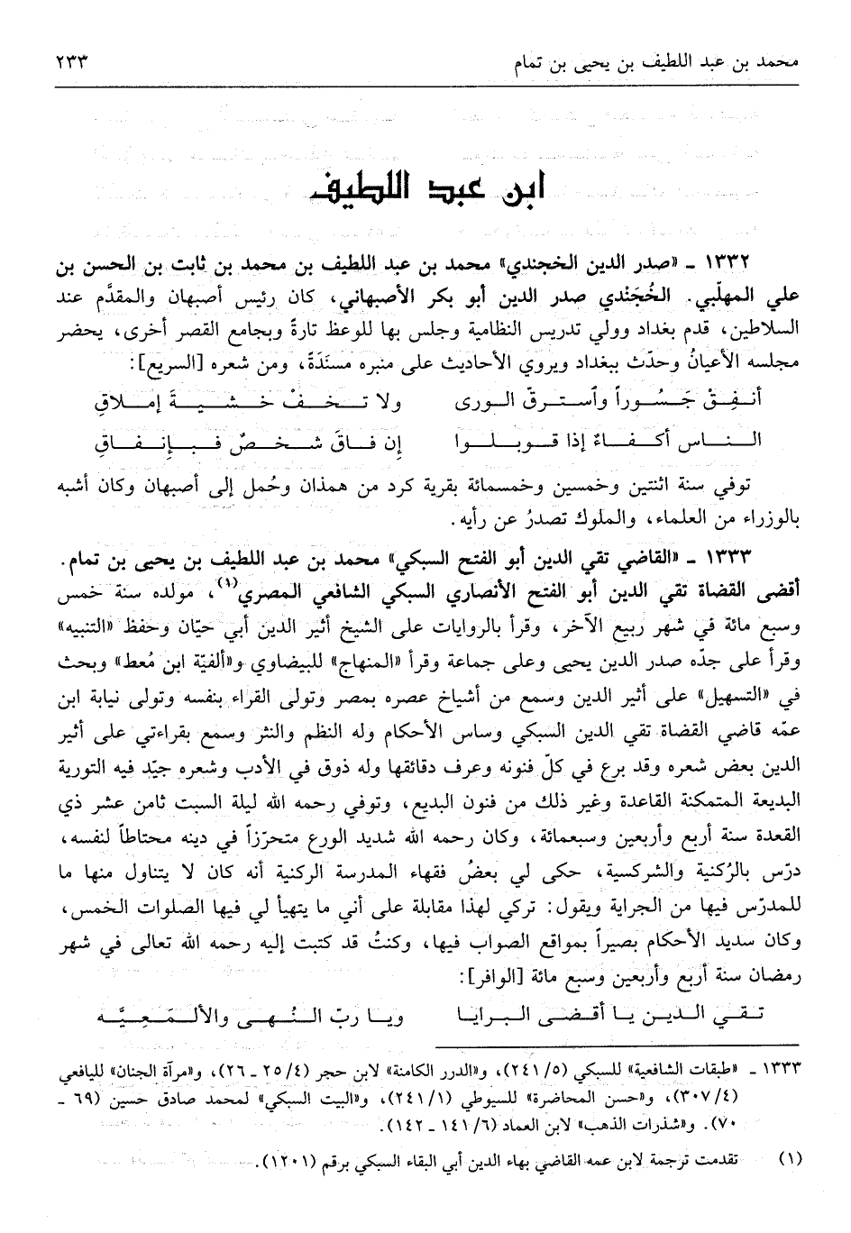 القَاضِي تَقِيّ الدّين أَبُو الْفَتْح السُّبْكِيّ مُحَمَّد بن عبد اللَّطِيف بن يحيى بن تَمام أقضى الْقُضَاة تَقِيّ الدّين أَبُو الْفَتْح الْأنْصَارِيّ السُّبْكِيّ الشَّافِعِي الْمصْرِيّ مولده سنة خمس وَسبع ماية فِي شهر ربيع الآخر وَقَرَأَ بالروايات على الشَّيْخ أثير الدّين أبي حَيَّان وَحفظ التَّنْبِيه وَقَرَأَ على جده صدر الدّين يحيى وعَلى جمَاعَة وَقَرَأَ الْمِنْهَاج للبيضاوي وألفية ابْن معط وَبحث فِي التسهيل على أثير الدّين وَسمع من أَشْيَاخ عصره بِمصْر وَتَوَلَّى الْقُرَّاء بِنَفسِهِ وَتَوَلَّى نِيَابَة ابْن عَمه قَاضِي الْقُضَاة تَقِيّ الدّين السُّبْكِيّ وساس الْأَحْكَام وَله النّظم والنثر وَسمع بِقِرَاءَتِي عَليّ أثير الدّين بعض شعره وَقد برع فِي كل فنونه وَعرف دقايقها وَله ذوق فِي الْأَدَب وشعره جيد فِيهِ التورية البديعة المتمكنة الْقَاعِدَة وَغير ذَلِك من فنون البديع وَتُوفِّي رَحمَه الله لَيْلَة السبت ثامن عشر ذِي الْقعدَة سنة أَربع وَأَرْبَعين وَسبع ماية وَكَانَ رَحمَه الله شَدِيد الْوَرع متحرزاً فِي دينه محتاطاً لنَفسِهِ درس بالركنية والسركسية حكى لي بعض فُقَهَاء الْمدرسَة الركنية أَنه كَانَ لَا يتَنَاوَل مِنْهَا مَا للمدرس فِيهَا من الجراية وَيَقُول تركي لهَذَا مُقَابلَة على أَنِّي مَا يتهيأ لي فِيهَا)