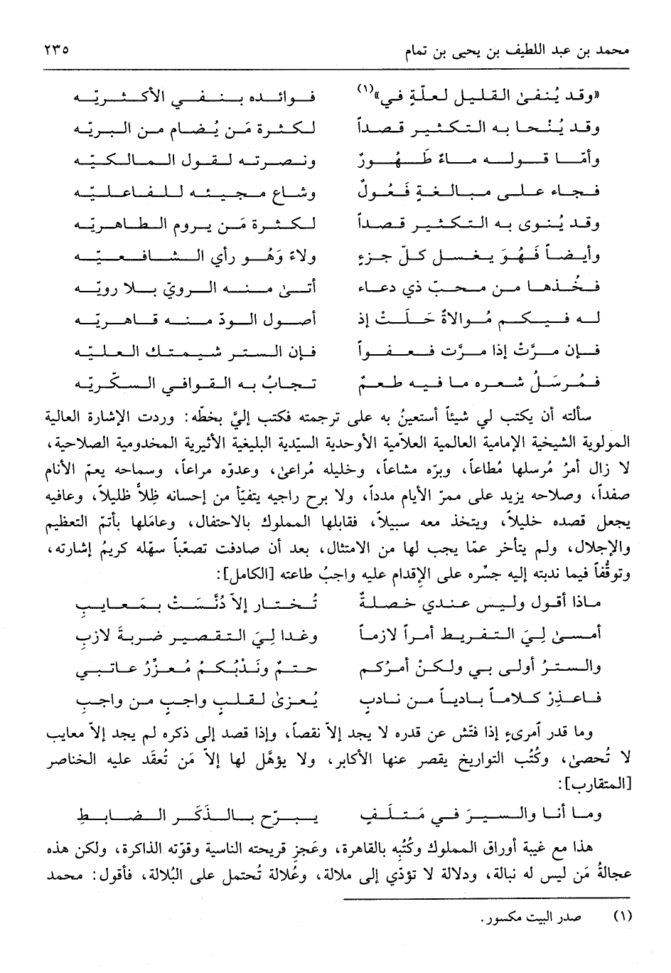 هَذَا مَعَ غيبَة أوراق الممولك وَكتبه بِالْقَاهِرَةِ وَعجز قريحته الناسية وقوته الذاكرة وَلَكِن هَذِه عجالة من لَيْسَ لَهُ نباله وَدلَالَة لَا تُؤدِّي إِلَى ملالة وعلالة تحْتَمل على البلالة فَأَقُول مُحَمَّد
