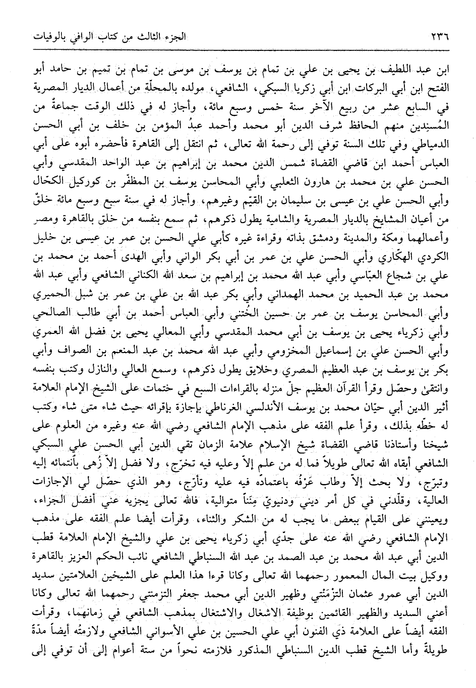 أبي حَيَّان مُحَمَّد بن يُوسُف الأندلسي الغرناطي باجازة باقريه حَيْثُ شَاءَ مَتى شَاءَ وَكتب لَهُ خطه بذلك وَقَرَأَ علم الْفِقْه على مَذْهَب الإِمَام الشَّافِعِي رَضِي الله عَنهُ وَغَيره من الْعُلُوم على شَيخنَا وأستاذنا قَاضِي الْقُضَاة شيخ الْإِسْلَام عَلامَة الزَّمَان تَقِيّ الدّين أبي الْحسن عَليّ السُّبْكِيّ الشَّافِعِي أبقاه الله تَعَالَى طَويلا فَمَا لَهُ من علم إِلَّا وَعَلِيهِ فِيهِ تخرج وَلَا فضل إِلَّا زهى بانتمايه إِلَيْهِ وتبرج وَلَا بحث إِلَّا وطاب عرفه باعتماده فِيهِ عَلَيْهِ وتأرج وَهُوَ الَّذِي حصل لي الإجازات الْعَالِيَة وقلدني فِي كل أَمر ديني ودنيوي منناً مُتَوَالِيَة فَالله تَعَالَى يجْزِيه عني أفضل الْجَزَاء ويعينني على الْقيام بِبَعْض مَا يجب لَهُ من الشُّكْر وَالثنَاء وقرأت أَيْضا علم الْفِقْه على مَذْهَب الإِمَام الشَّافِعِي رَضِي الله عَنهُ على جدي أبي زَكَرِيَّاء يحيى بن عَليّ وَالشَّيْخ الإِمَام الْعَلامَة قطب الدّين أبي عبد الله مُحَمَّد بن عبد الصَّمد بن عبد الله السنباطي الشَّافِعِي نايب الحكم الْعَزِيز بِالْقَاهِرَةِ ووكيل بَيت المَال الْمَعْمُور رحمهمَا الله تَعَالَى وَكَانَا قرءآ هَذَا الْعلم على الشَّيْخَيْنِ العلامتين سديد الدّين أبي عَمْرو عُثْمَان التزمنتي وظهير الدّين أبي مُحَمَّد جَعْفَر التزمنتي رحمهمَا الله تَعَالَى وَكَانَا أَعنِي السديد والظهير القايمين بوظيفة الاشغال والاشتغال بِمذهب الشَّافِعِي فِي زمانهما وقرأت الْفِقْه أَيْضا على الْعَلامَة ذِي الْفُنُون أبي عَليّ الحجسين بن عَليّ الأسواني الشَّافِعِي ولازمته أَيْضا على الْعَلامَة ذِي الْفُنُون أبي عَليّ الْحُسَيْن بن عَليّ الأسواني الشَّافِعِي ولازمته أَيْضا مُدَّة طَوِيلَة وَأما الشَّيْخ قطب الدّين السنباطي الْمَذْكُور فلازمته نَحوا من سِتَّة أَعْوَام إِلَى أَن توفّي إِلَى