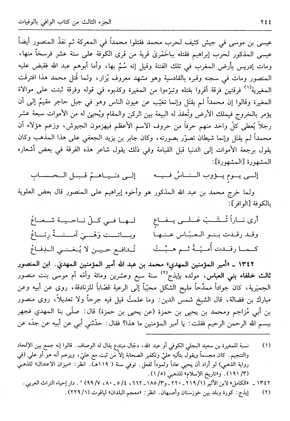 أَمِير الْمُؤمنِينَ الْمهْدي مُحَمَّد بن عبد الله أَمِير الْمُؤمنِينَ الْمهْدي ابْن الْمَنْصُور ثَالِث خلفاء بني الْعَبَّاس مولده بإيذج سنة سبع وَعشْرين وماية وَأمه أم مُوسَى بنت مَنْصُور الحميرية كَانَ جواداً ممدحاً مليح الشكل محبباً إِلَى الرّعية قصاباً للزنادقة روى عَن أَبِيه وَعَن مبارك بن فضَالة قَالَ الشَّيْخ شمس الدّين وَمَا علمت قيل فِيهِ جرحا وَلَا تعديلاً روى مَنْصُور بن أبي مُزَاحم وَمُحَمّد بن يحيى بن حَمْزَة عَن يحيى بن حَمْزَة قَالَ صلى بِنَا الْمهْدي فجهر بِبسْم الله الرَّحْمَن الرَّحِيم فَقلت يَا أَمِير الْمُؤمنِينَ مَا هَذَا فَقَالَ حَدثنِي أبي عَن أَبِيه عَن جده عَن