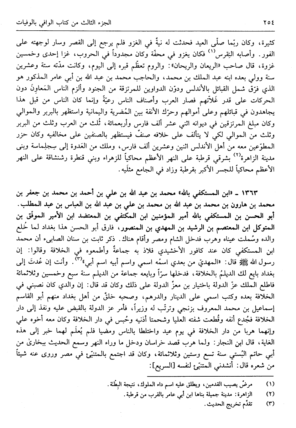 المستكفي بِاللَّه أَمِير الْمُؤمنِينَ ابْن المكتفي ابْن المعتضد ابْن الْأَمِير الْمُوفق ابْن المتَوَكل ابْن المعتصم ابْن الرشيد ابْن الْمهْدي ابْن الْمَنْصُور فَارق أَبُو الْحسن هَذَا بَغْدَاد لما خلع وَالِده وسملت عَيناهُ وهرب فَدخل الشَّام ومصر وَأقَام هُنَاكَ ذكر ثَابت بن سِنَان الصَّابِئ أَن مُحَمَّد بن المستكفي كَانَ عِنْد كافور الأخشيذي فلاذ بِهِ جمَاعَة وأطمعوه فِي الْخلَافَة وَقَالُوا أَن رَسُول الله صلى الله عَلَيْهِ وَسلم قَالَ الْمهْدي من بعدِي اسْمه أسمى وَاسم أَبِيه اسْم أبي وَأَنت إِن عدت إِلَى بَغْدَاد بَايع لَك الديلم بالخلافة فَدَخلَهَا سرا وَبَايَعَهُ جمَاعَة من الديلم سنة سبع وَخمسين وَثلث ماية فَاطلع الْملك عز الدولة بختيار ابْن معز الدولة على ذَلِك وَكَانَ قد قَالَ إِن وَالِدي كَانَ نصبني فِي الْخلَافَة بعده وَكتب اسْمِي على الدِّينَار وَالدِّرْهَم وَصَحبه خلق من أهل بَغْدَاد مِنْهُم أَبُو الْقَاسِم اسماعيل بن مُحَمَّد الْمَعْرُوف بزنجي وترتب لَهُ وزيراً فَأمر عز الدولة بِالْقَبْضِ عَلَيْهِ وَنفذ إِلَى دَار الْخلَافَة فجدع أَنفه وَقطعت شفته الْعليا وشحمتا أُذُنَيْهِ وَحبس فِي دَار الْخلَافَة وَكَانَ مَعَه أَخُوهُ عَليّ وأنهما هربا من دَار الْخلَافَة فِي يَوْم عيد واختلطا بِالنَّاسِ مضيا فَلم يعلم لَهما خبر إِلَى هَذِه الْغَايَة قَالَ ابْن النجار وَلما هرب قصد خُرَاسَان وَدخل مَا وَرَاء النَّهر وَسمع الحَدِيث ببخارا من أبي حَاتِم البستي سنة تسع وَسِتِّينَ وَثلث ماية وَكَانَ قد اجْتمع بالمتنبي فِي مصر وروى عَنهُ شَيْئا من شعره قَالَ أَنْشدني المتنبئ لنَفسِهِ