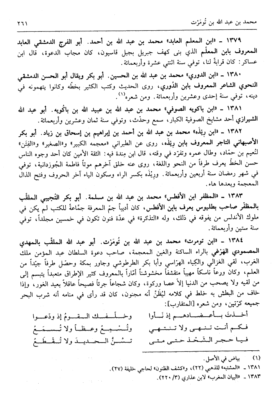 ابْن تومرت مُحَمَّد بن عبد الله بن تومرت أَبُو عبد الله الملقب بالمهدي المصمودي الهرغي بالراء الساكنة والغين الْمُعْجَمَة صَاحب دَعْوَة السُّلْطَان عبد الْمُؤمن ملك الغرب لَقِي الْغَزالِيّ والكياء الهراسي وَأَبا بكر الطرطوشي وجاور بِمَكَّة وَحصل طرفا جيدا من الْعلم وَكَانَ ورعاً ناسكاً مهيباً متقشفاً مخشوشناً أماراً بالمعرف كثير الإطراق متعبداً يبتسم إِلَى من لقِيه وَلَا يصحب من الدُّنْيَا إِلَّا عَصا وركوة وَكَانَ شجاعاً جرئاً فصيحاً عَاقِلا بعيد الْغَوْر وَإِذا خَافَ من الْبَطْش بِهِ خلط فِي كَلَامه ليظن أَنه مَجْنُون كَانَ قد رأى فِي مَنَامه أَنه شرب الْبَحْر جَمِيعه كرتين وَمن شعره