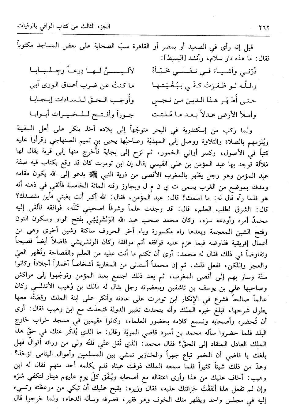 مقصدك قَالَ الشرق لطلب الْعلم قَالَ قد وجدت علما وشرفاً اصحبني تنله فوافقه فَألْقى إِلَيْهِ مُحَمَّد أمره وأودعه سره وَكَانَ مُحَمَّد صحب عبد الله الونشريشي بِفَتْح الْوَاو وَسُكُون النُّون وَفتح الشين الْمُعْجَمَة وَبعدهَا رَاء مَكْسُورَة وياء آخر الْحُرُوف ساكة وشين أُخْرَى وَهِي من أَعمال إفريقية ففاضوه فِيمَا عزم عَلَيْهِ فوافقه أتم مُوَافقَة وَكَانَ الونشريشي فَاضلا أَيْضا فصحياً وتفاوضا فِي ذَلِك فَقَالَ لَهُ مُحَمَّد أرى أَن تكْتم مَا أَنْت عَلَيْهِ من الْعلم والفصاحة وَتظهر العي وَالْعجز واللكن فَفعل ذَلِك ثمَّ إِن مُحَمَّدًا استدنى من المغاربة أشخاصاً أَغْمَارًا أجلاداً وَكَانُوا ستى وَسَار بهم لى أقْصَى الْمغرب ثمَّ بعد ذَلِك اجْتمع بِعَبْد الْمُؤمن وتوجهوا إِلَى مراكش وصاحبها عَليّ بن يُوسُف بن تاشفين وبحضرته رجل يُقَال لَهُ مَالك بن وهيب الأندلسي وَكَانَ عَالما صَالحا فشرع فِي الْإِنْكَار ابْن تومرت على عَادَته وَأنكر على ابْنة الْملك وقصته مَعهَا يطول شرحها فَبلغ خَبره الْملك وَأَنه يتحدث تَغْيِير الدولة فَتحدث مَعَ ابْن وهيب فَقَالَ أرى أَن تحضره وَأَصْحَابه ونسمع كَلَامه بِحُضُور الْعلمَاء وَكَانُوا مقيمين فِي مَسْجِد خراب خَارج الْبَلَد فَلَمَّا حَضَرُوا سَأَلَهُ مُحَمَّد بن أسود قَاضِي المرية وَقَالَ مَا الَّذِي يذكر عَنْك فِي حق هَذَا الْملك الْعَادِل المنقاد إل الْحق فَقَالَ مُحَمَّد الَّذِي نقل عني قلته ولي من رُوَائِهِ أَقْوَال فَهَل بلغك يَا قَاضِي أَن الْخمر تبَاع جَهرا والخنازير تمشي بَين الْمُسلمين وأموال الْيَتَامَى تُؤْخَذ وعد من ذَلِك شَيْئا كثيرا فَلَمَّا سَمعه الْملك ذرفت عَيناهُ فَلم يكلمهُ أحد مِنْهُم فَقَالَ لَهُ ابْن وهيب أَخَاف عَلَيْك من هَذَا وَأرى اعتقاله مَعَ أَصْحَابه وَينْفق كل يَوْم عَلَيْهِم دِينَار لتكفي شَره وَإِن لم تفعل هَذَا أنفقت خزاينك عَلَيْهِ فَقَالَ وزيره يقبح عَلَيْك أَن تبْكي من موعظته وتسيء إِلَيْهِ فِي مجْلِس وَاحِد ويهظر مِنْك الْخَوْف وَهُوَ فَقير فَصَرفهُ وَسَأَلَهُ الدُّعَاء وَلما خَرجُوا قَالَ