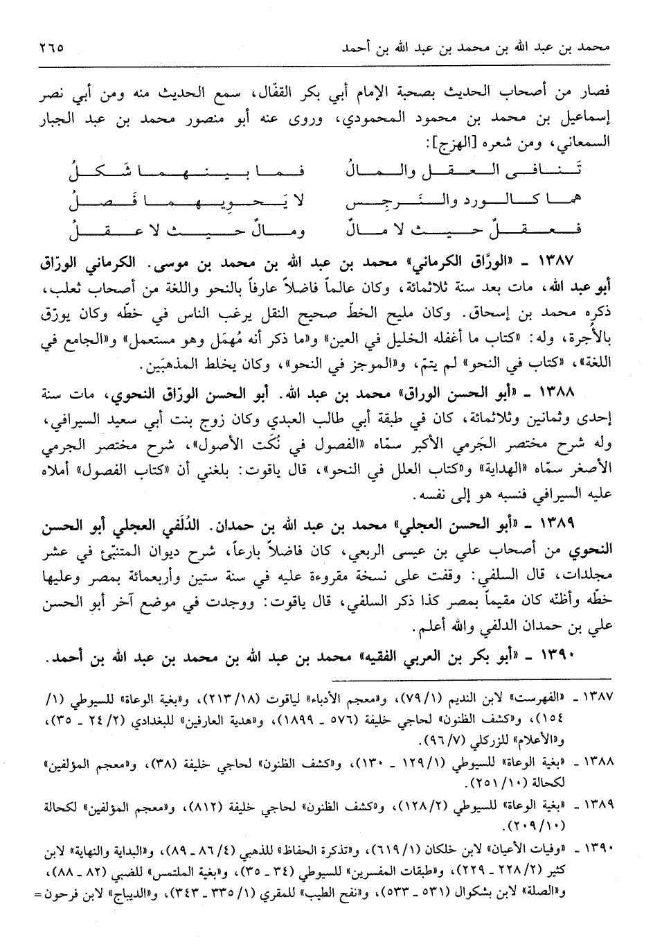 الْوراق الْكرْمَانِي مُحَمَّد بن عبد الله بن مُحَمَّد بن مُوسَى الْكرْمَانِي الْوراق أَبُو عبد الله مَاتَ بعد سنة ثلث ماية وَكَانَ عَالما فَاضلا عَارِفًا بالنحو واللغة من أَصْحَاب ثَعْلَب ذكره مُحَمَّد بن إِسْحَق وَكَانَ مليح الْخط صَحِيح النَّقْل يرغب النَّاس فِي خطه وَكَانَ يورق بِالْأُجْرَةِ وَله كتاب مَا أغفله الْخَلِيل فِي الْعين وَمَا ذكر أَنه مهمل وَهُوَ مُسْتَعْمل وَالْجَامِع فِي اللُّغَة كتاب فِي النَّحْو لم يتم والموجز فِي النَّحْو وَكَانَ يخلط المذهبين