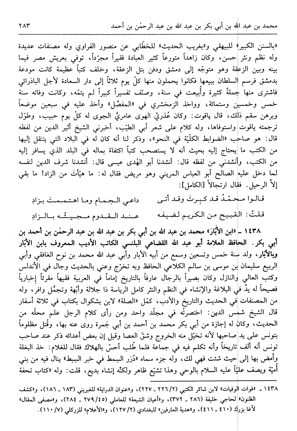 ابْن الْأَبَّار مُحَمَّد بن عبد الله بن أبي بكر بن عبد الله بن عبد الرَّحْمَن بن أَحْمد بن أبي بكر الْحَافِظ الْعَلامَة أَبُو عبد الله الْقُضَاعِي البلنسي الْكَاتِب الأديب الْمَعْرُوف بِابْن الْأَبَّار وبالأبار ولد سنة خمس وَتِسْعين وَسمع من أَبِيه الْأَبَّار وأبى عبد الله مُحَمَّد بن نوح الغافقي وأبى الرّبيع سُلَيْمَان بن مُوسَى بن سَالم الكلاعى الْحَافِظ وَبِه تخرج وعني بِالْحَدِيثِ وجال فِي الأندلس وَكتب العالي والنازل وَكَانَ بَصيرًا بِالرِّجَالِ عَارِفًا بالتاريخ إِمَامًا فِي الْعَرَبيَّة فَقِيها مقرئاً اخبارياً فصيحاً لَهُ يَد فِي البلاغة والإنشاء فِي النّظم والنثر كَامِل الرياسة ذَا جلالة وأبهة وتجمل وافر وَله من المصنفات فِي الحَدِيث والتاريخ وَالْأَدب كمل الصِّلَة لِابْنِ بشكوال بِكِتَاب فِي ثلثة أسفار قَالَ الشَّيْخ شمس الدّين اختصرته فِي مُجَلد وَاحِد وَمن رأى كَلَام الرجل علم مَحَله من الحَدِيث وَكَانَ لَهُ إجَازَة من أبي بكر مُحَمَّد بن أَحْمد بن أبي جَمْرَة روى عَنهُ بهَا وَقتل مَظْلُوما بتونس على يَد صَاحبهَا لِأَنَّهُ تخيل مِنْهُ الْخُرُوج وشق الْعَصَا وَقيل إِن بعض أعدايه ذكر عِنْد صَاحب تونس أَنه ألف تَارِيخا وَأَنه تكلم فِيهِ فِي جمَاعَة فَلَمَّا طلب أحسن بِالْهَلَاكِ فَقَالَ للغلام خُذ البغلة وآمض بهَا إِلَى حَيْثُ شِئْت فَهِيَ لَك وَله جُزْء سَمَّاهُ دُرَر السمط فِي خبر السبط ينَال فِيهِ من بني أُميَّة ويصف عليا عَلَيْهِ السَّلَام بِالْوَحْي وَهَذَا تشيع)