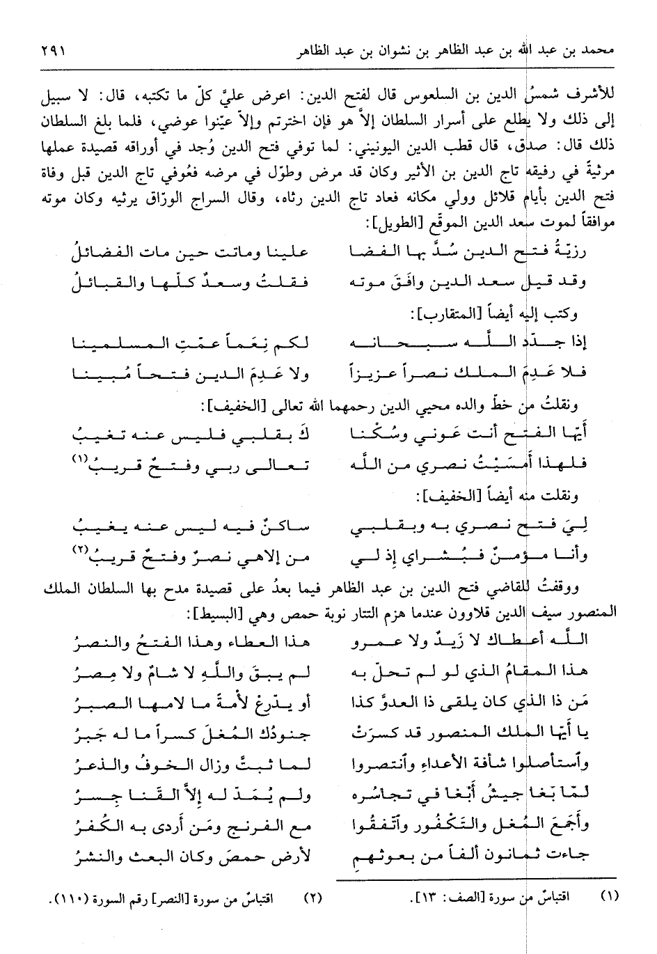 ووقفت للْقَاضِي فتح الدّين ابْن عبد الظَّاهِر فِيمَا بعد على قصيدة مدح بهَا السُّلْطَان الْملك الْمَنْصُور سيف الدّين قلاوون عِنْدَمَا هزم التتار نوبَة حمص وَهِي