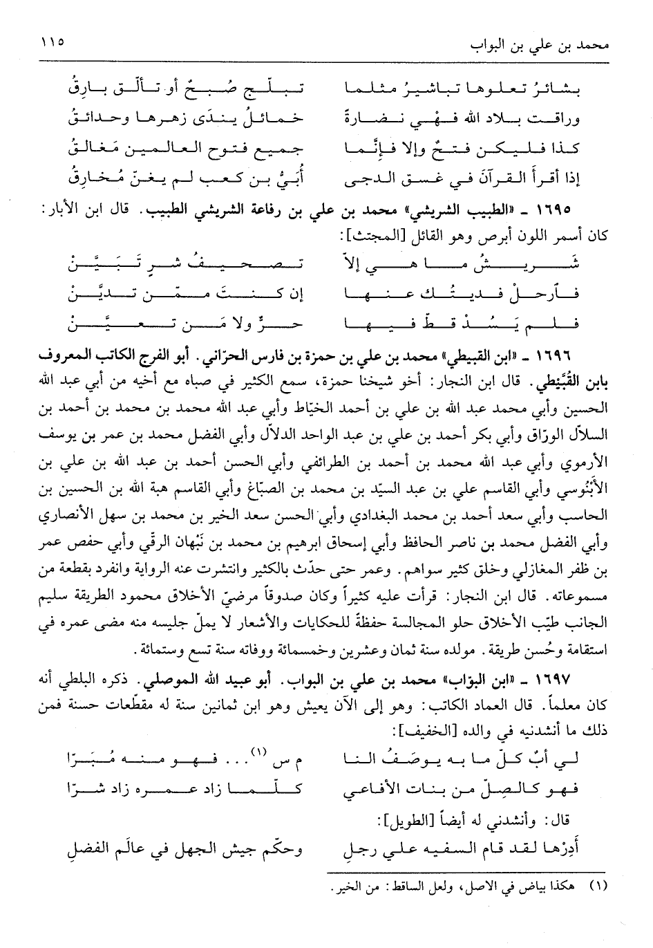 ذكره البلطي أَنه كَانَ معلما قَالَ الْعِمَاد الْكَاتِب وَهُوَ الْآن يعِيش وَهُوَ ابْن ثَمَانِينَ سنة لَهُ مفقطعات حَسَنَة فَمن ذَلِك مَا أنشدنيه فِي وَالِده لي أبٌ كل مَا بِهِ يُوصف الناسفهو مِنْهُ مبرا