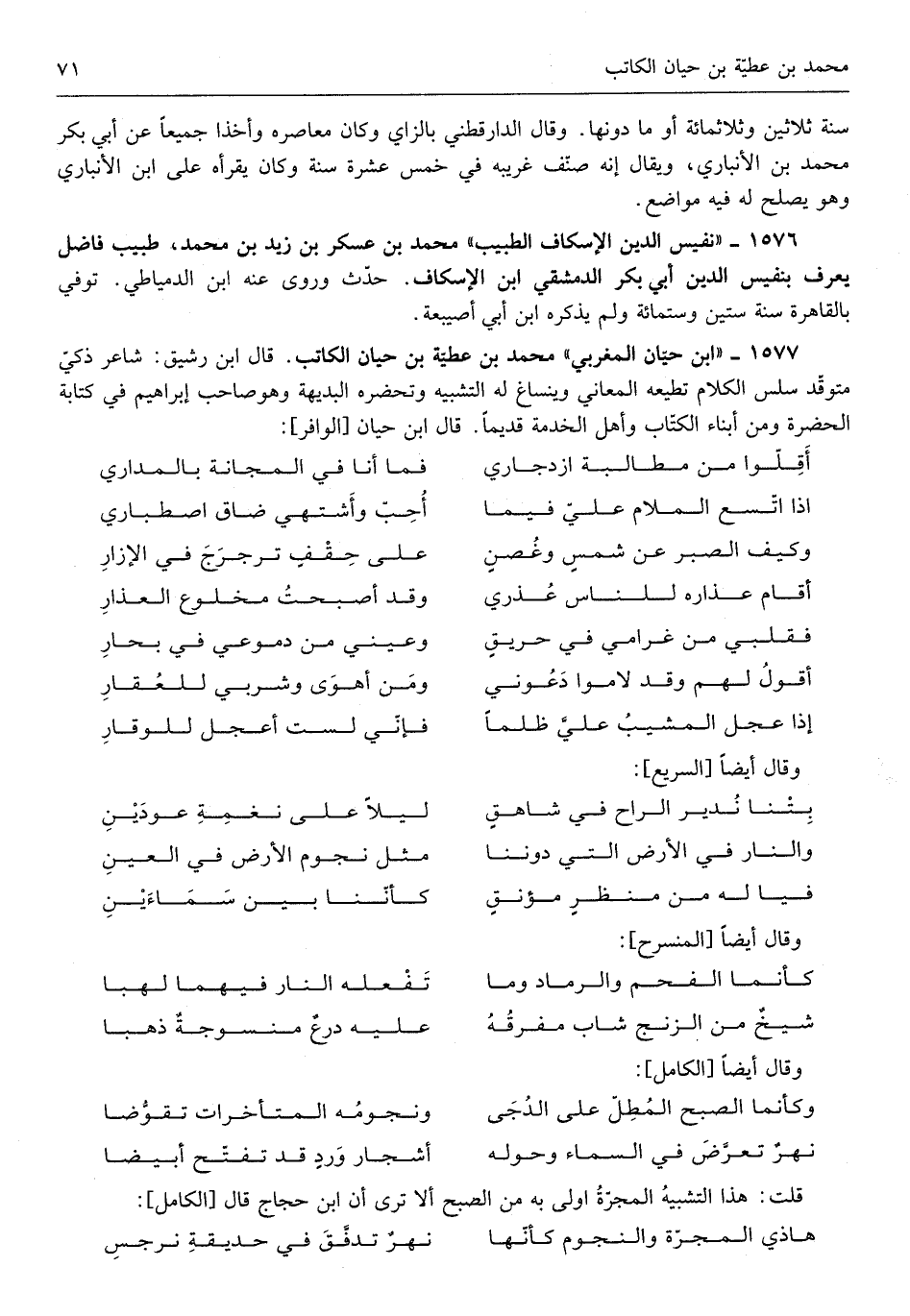 ابْن حَيَّان المغربي مُحَمَّد بن عَطِيَّة بن حَيَّان الْكَاتِب قَالَ ابْن رَشِيق شَاعِر ذكي متوقد سَلس الْكَلَام تُطِيعهُ الْمعَانِي وينساغ لَهُ التَّشْبِيه وتحضره البديهة وَهُوَ صَاحب إِبْرَاهِيم فِي كِتَابَة الحضرة وَمن أَبنَاء الْكتاب وَأهل الْخدمَة قَدِيما
