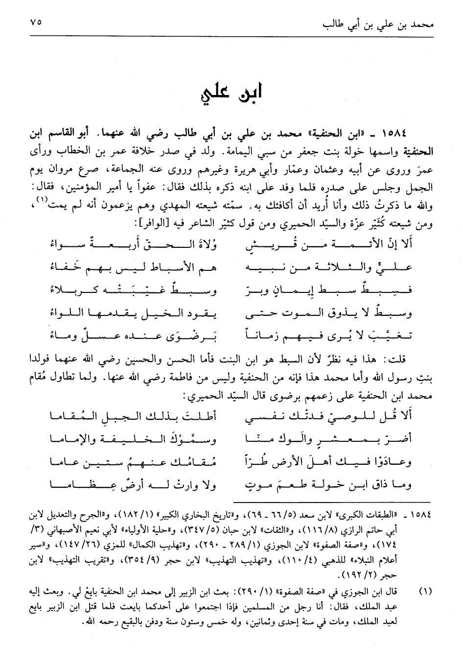 ابْن الْحَنَفِيَّة مُحَمَّد بن عَليّ بن أبي طَالب رَضِي الله عَنْهُمَا أَبُو الْقَاسِم ابْن الْحَنَفِيَّة وَاسْمهَا خَوْلَة بنت جَعْفَر من سبي الْيَمَامَة