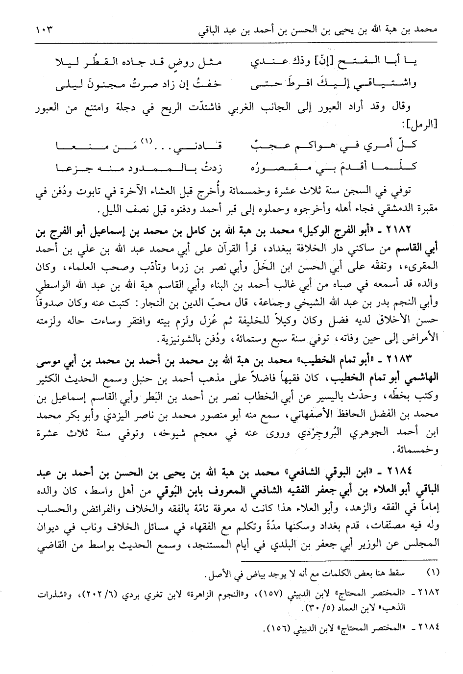 مُحَمَّد بن هبة الله بن يحيى بن الْحسن بن أَحْمد بن عبد الْبَاقِي أَبُو الْعَلَاء ابْن أبي جَعْفَر الْفَقِيه الشَّافِعِي الْمَعْرُوف بِابْن البوقي من أهل وَاسِط كَانَ وَالِده إِمَامًا فِي الْفِقْه والزهد وَأَبُو الْعَلَاء هَذَا كَانَت لَهُ معرفَة تَامَّة بالفقه وَالْخلاف والفرائض والحساب وَله فِيهِ مصنفات قدم بغداذ وسكنها مُدَّة وَتكلم مَعَ الْفُقَهَاء فِي مسَائِل الْخلاف وناب فِي ديوَان الْمجْلس عَن الْوَزير أبي جَعْفَر ابْن الْبَلَدِي ي أَيَّام المستنجد وَسمع الحَدِيث بواسط من القَاضِي