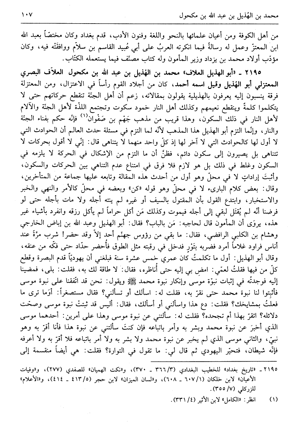 مُحَمَّد بن الْهُذيْل بن عبد الله بن مَكْحُول العلاف الْبَصْرِيّ المعتزلي أَبُو الْهُذيْل وَقيل اسْمه أَحْمد وَكَانَ من أجلاد الْقَوْم رَأْسا فِي الاعتزال وَمن الْمُعْتَزلَة فرقة ينسبون إِلَيْهِ يعرفونه بالهذيلية يَقُولُونَ بمقالاته زعم أَن أهل الْجنَّة تَنْقَطِع حركاتهم حَتَّى لَا يتكلموا كلمة وَيَنْقَطِع نعيمهم وَكَذَلِكَ أهل النَّار خمود سكُوت وتجتمع اللَّذَّة لأهل الْجنَّة والآلام لأهل النَّار فِي ذَلِك السّكُون وَهَذَا قريب من مَذْهَب جهم بن صَفْوَان فَإِنَّهُ حكم بِفنَاء الْجنَّة وَالنَّار وَإِنَّمَا الْتزم أَبُو الْهُذيْل هَذَا الْمَذْهَب لِأَنَّهُ لما الْتزم فِي مسئلة حدث الْعَالم أَن الْحَوَادِث الَّتِي لَا أول لَهَا كالحوادث الَّتِي لَا آخر لَهَا إِذْ كل وَاحِد مِنْهُمَا لَا يتناهى قَالَ إِنِّي لَا أَقُول بحركات لَا تتناهى بل يصيرون إِلَى سُكُون دَائِم فَظن أَن مَا الْتزم من الْإِشْكَال فِي الْحَرَكَة لَا يلْزمه فِي السّكُون وَغلط فِي ذَلِك بل هُوَ لَازم فَلَا فرق فِي امْتنَاع عدم التناهي بَين الحركات والسكون وَأثبت إرادات لَا فِي مَحل وَهُوَ أول من أحدث هَذِه الْمقَالة وَتَابعه عَلَيْهَا جمَاعَة من الْمُتَأَخِّرين وَقَالَ بعض كَلَام البارئ لَا فِي مَحل وَهُوَ قَوْله كن وَبَعضه فِي مَحل كالأمر وَالنَّهْي وَالْخَبَر والاستخبار وابتدع القَوْل بِأَن الْمَقْتُول بِالسَّيْفِ أَو غَيره لم ينْتَه أَجله وَلَا مَاتَ بأجله حَتَّى لَو فَرضنَا أَنه لم يقتل لبقي إِلَى أَجله فَيَمُوت وَكَذَلِكَ من أكل حَرَامًا لم يَأْكُل رزقه وَانْفَرَدَ بأَشْيَاء غير هَذِه يرْوى عَن الْمَأْمُون قَالَ لحاجبه من بِالْبَابِ فَقَالَ أَبُو الْهُذيْل وَعبد الله بن إباض الْخَارِجِي وَهِشَام ابْن الْكَلْبِيّ الرافضي فَقَالَ مَا بَقِي من رُؤُوس جَهَنَّم أحد إِلَّا وَقد حضر شرب مرّة عِنْد أنَاس فراود غُلَاما أَمْرَد فَضَربهُ بتور فَدخل فِي رقبته مثل الطوق فأحضر حداد حَتَّى فكه من عُنُقه وَقَالَ أَبُو الْهُذيْل أول مَا تَكَلَّمت كَانَ عمري خمس عشرَة سنة فبلغني أَن يَهُودِيّا قدم الْبَصْرَة وَقطع كل من فِيهَا فَقلت لِعَمِّي امْضِ بِي إِلَيْهِ حَتَّى أناظره فَقَالَ لَا طَاقَة لَك بِهِ فَقلت بلَى فمضينا إِلَيْهِ فَوَجَدته فِي إِثْبَات نبوة مُوسَى وإنكار نبوة مُحَمَّد صلى الله عَلَيْهِ وَسلم وَيَقُول نَحن قد اتفقنا على نبوة مُوسَى فأثبتوا لنا نبوة مُحَمَّد حَتَّى نقر بِهِ فَقلت لَهُ أَسأَلك أَو تَسْأَلنِي فَقَالَ مستصغراً أَو مَا ترى مَا فعلت بمشايخك فَقلت دع هَذَا واسألني أَو أَسأَلك فَقَالَ أَلَيْسَ قد ثبتَتْ نبوة مُوسَى وَصحت دلائله اتقر بِهَذَا أم تجحده فَقلت لَهُ سَأَلتنِي عَن نبوة مُوسَى وَهَذَا على أَمريْن أَحدهمَا مُوسَى الَّذِي أخبر عَن نبوة مُحَمَّد وَبشر بِهِ وَأمر باتباعه فَإِن كنت سَأَلتنِي عَن نبوة هَذَا فَأَنا أقرّ بِهِ وَهُوَ نَبِي وَالثَّانِي مُوسَى الَّذِي لم يخبر)
