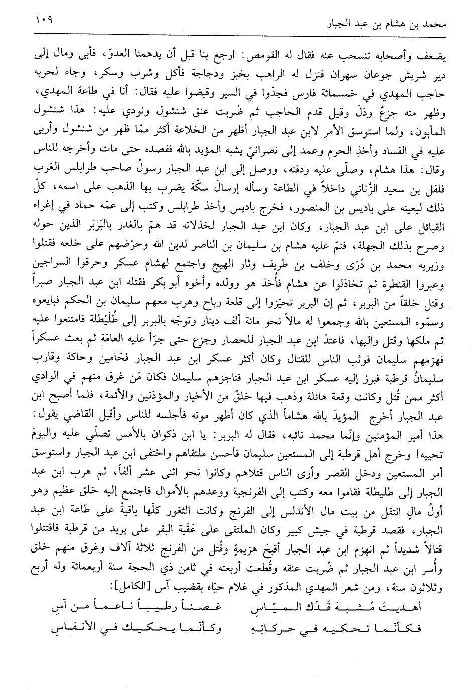 سُلَيْمَان فَوَثَبَ النَّاس لِلْقِتَالِ وَكَانَ أَكثر عَسْكَر ابْن عبد الْجَبَّار فحامين وحاكة وقارب سُلَيْمَان قرطبة فبرر إِلَيْهِ عَسْكَر ابْن عبد الْجَبَّار فناجزهم سُلَيْمَان فَكَانَ من غرق مِنْهُم فِي الْوَادي أَكثر مِمَّن قتل وَكَانَت وقْعَة هائلة وَذهب فِيهَا خلق من الأخيار والمؤذنين وَالْأَئِمَّة فَلَمَّا أصبح ابْن عبد الْجَبَّار أخرج الْمُؤَيد بِاللَّه هشاماً الَّذِي كَانَ أظهر مَوته فأجلسه للنَّاس وَأَقْبل القَاضِي يَقُول هَذَا أَمِير الْمُؤمنِينَ وَإِنَّمَا مُحَمَّد نَائِبه فَقَالَ لَهُ البربر يَا ابْن ذكْوَان بالْأَمْس تصلي عَلَيْهِ وَالْيَوْم تحييه وَخرج أهل قرطبة إِلَى المستعين سُلَيْمَان فَأحْسن ملتقاهم واختفى ابْن عبد الْجَبَّار واستوسق أَمر المستعين وَدخل الْقصر وَأرى النَّاس قتلاهم وَكَانُوا نَحْو اثْنَي عشر ألفا ثمَّ هرب ابْن عبد الْجَبَّار إِلَى طليطلة فَقَامُوا مَعَه وَكتب إِلَى الفرنجية وَوَعدهمْ بالأموال فَاجْتمع إِلَيْهِ خلق عَظِيم وَهُوَ أول مَال انْتقل من بَيت مَال الأندلس إِلَى الفرنج وَكَانَت الثغور كلهَا بَاقِيَة على طَاعَة ابْن عبد الْجَبَّار فقصد قرطبة فِي جَيش كَبِير وَكَانَ الْمُلْتَقى على عقبَة الْبَقر على بريد من قرطبة فَاقْتَتلُوا قتالاً شَدِيدا ثمَّ انهزم ابْن عبد الْجَبَّار أقبح هزيمَة وَقتل من الفرنج ثَلَاثَة آلَاف وغرق مِنْهُم خلق وَأسر ابْن عبد الْجَبَّار ثمَّ ضربت عُنُقه وَقطعت أربعته فِي ثامن ذِي الْحجَّة سنة أَربع مائَة وَله أَربع وَثَلَاثُونَ سنة وَمن شعر الْمهْدي الْمَذْكُور فِي غُلَام حَيَّاهُ بقضيب آس