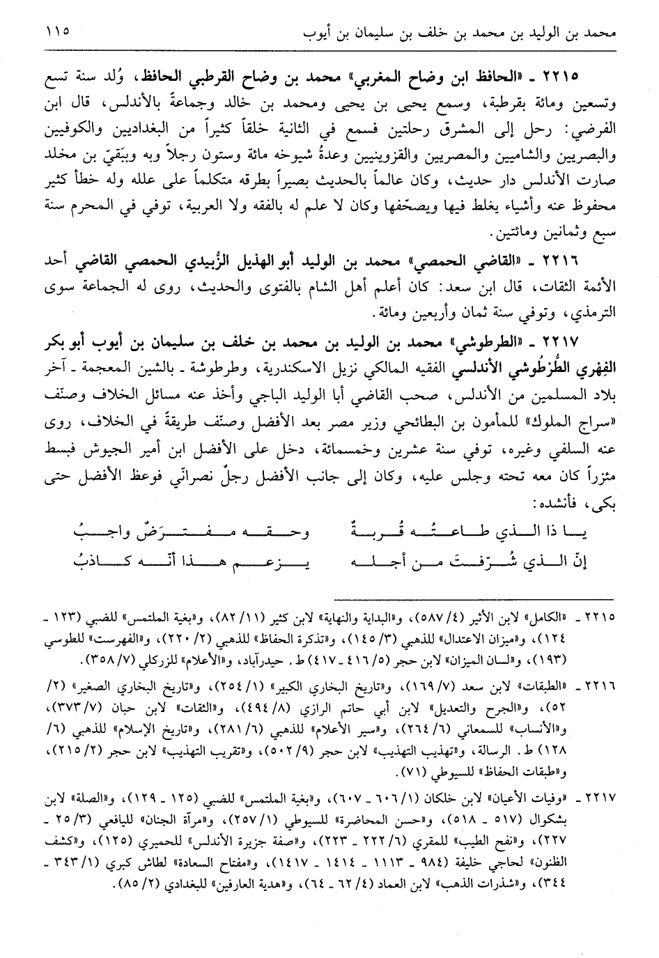 مُحَمَّد بن الْوَلِيد بن مُحَمَّد بن خلف بن سُلَيْمَان بن أَيُّوب أَبُو بكر الفِهري الطرطوشي الأندلسي الْفَقِيه الْمَالِكِي نزيل الاسكندرية وطرطوشة بالشين الْمُعْجَمَة آخر بِلَاد الْمُسلمين من الأندلس صحب القَاضِي أَبَا الْوَلِيد الْبَاجِيّ وَأخذ عَنهُ مسَائِل الْخلاف وصنف سراج الْمُلُوك لِلْمَأْمُونِ ابْن البطائحي وَزِير مصر بعد الْأَفْضَل وصنف طَريقَة فِي الْخلاف روى عَنهُ السلَفِي وَغَيره توفّي سنة عشْرين وَخمْس مائَة دخل على الْأَفْضَل ابْن أَمِير الجيوش فَبسط مئزراً كَانَ مَعَه تَحْتَهُ وَجلسَ عَلَيْهِ وَكَانَ إِلَى جَانب الْأَفْضَل رجل نَصْرَانِيّ فوعظ الْأَفْضَل حَتَّى بَكَى فأنشده)